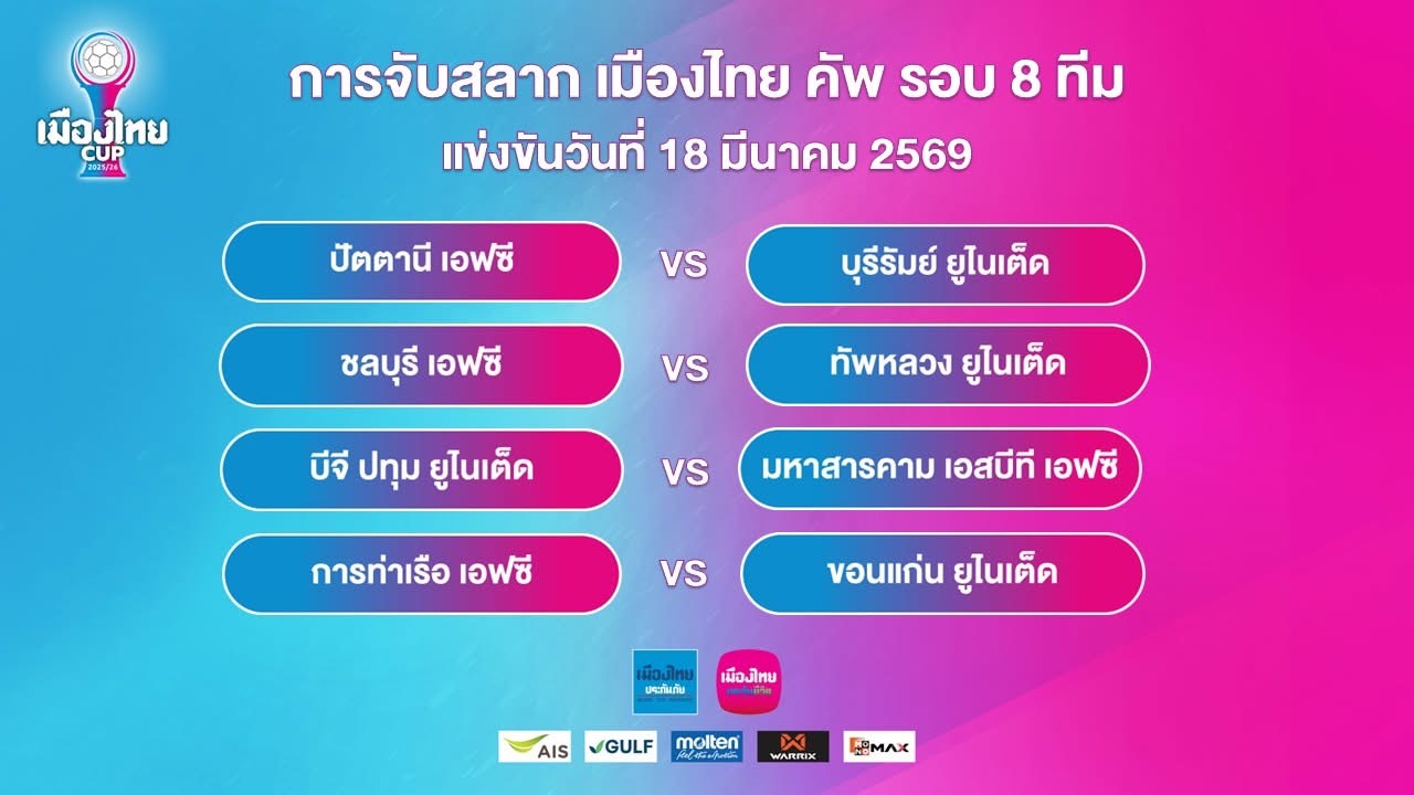 ผลการจับสลากฟุตบอลถ้วย “เมืองไทย คัพ” ฤดูกาล 2025/26 รอบ 8 ทีมสุดท้าย มีดังนี้