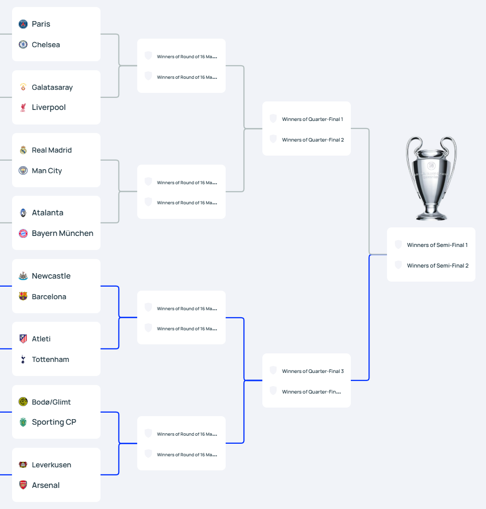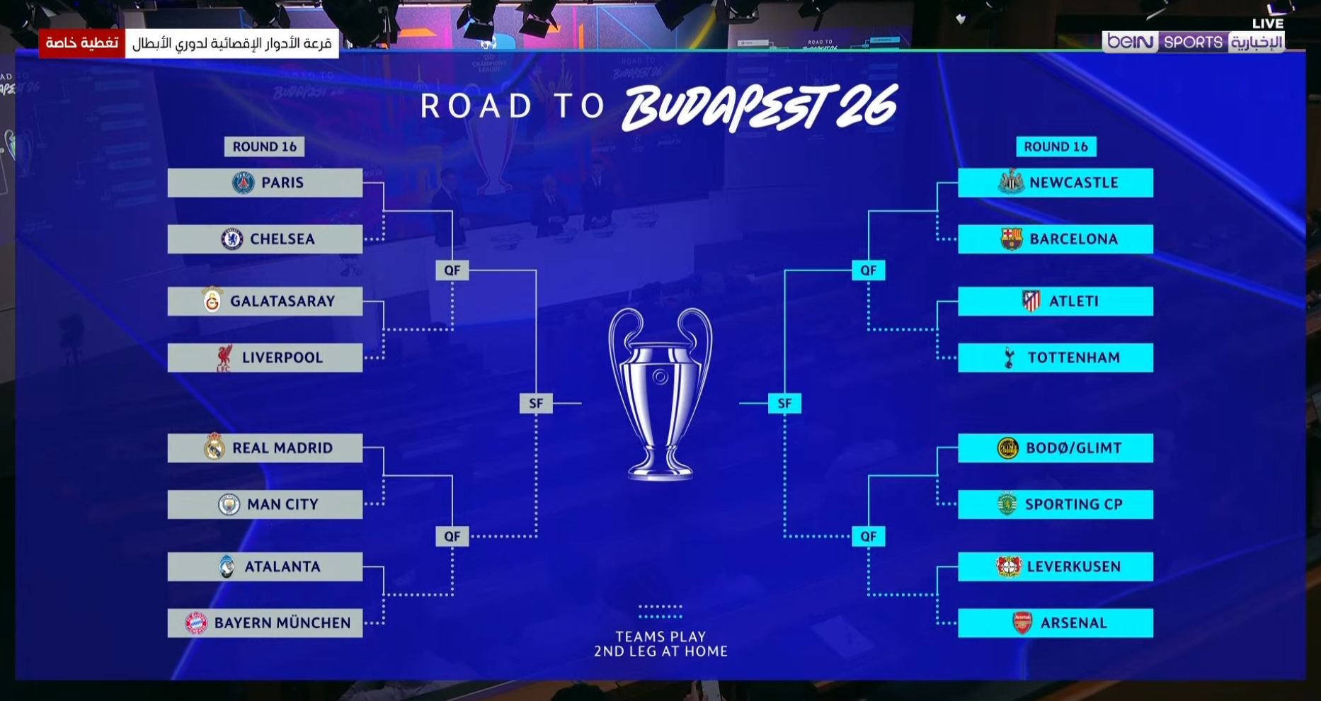 อาร์เซน่อล ที่กำลังเป็นจ่าฝูงของพรีเมียร์ลีกถูกจับให้พบกับ ไบเออร์ เลเวอร์คูเซ่น ทีมเก่าของ ไค ฮาแวร์ตซ์ และอีกหนึ่งทีมจากอังกฤษอย่าง ลิเวอร์พูล ก็จะต้องพบกับ กาลาตาซาราย ที่เคยปราบพวกเขามาในรอบลีกเฟสซีซั่นนี้