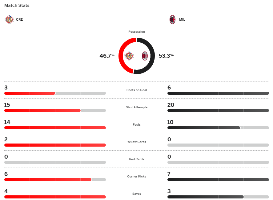 เกือบจะจบลงด้วยผลเสมอแล้วเมื่อ เอซี มิลาน มีโอกาสมากมายแต่ยิงทิ้งขว้างเสียเยอะ กระนั้นท้ายเกมพวกเขามาได้ สตราฮินย่า พาฟโลวิช ยิงพานำก่อนที่จะบวกเพิ่มอีกลูกจาก ราฟาเอล เลเอา ช่วยให้คว้าชัยเหนือ เครโมเนเซ่ 2-0 กลับไปตามหลัง อินเตอร์ มิลาน จ่าฝูงที่ 10 แต้มตามเดิม