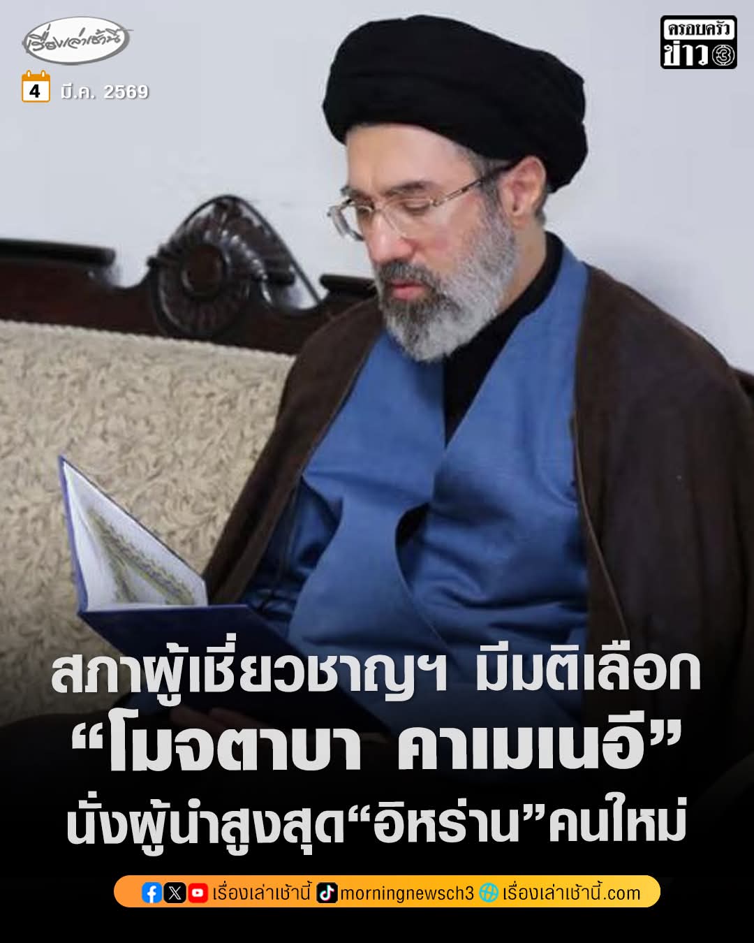 วันนี้ (4 มีนาคม 69) เมื่อเวลา 04.00 น. ตามเวลาในประเทศไทย สำนักข่าวทางการของอิหร่าน Iran International (Iranintl) รายงานว่า สภาผู้เชี่ยวชาญของอิหร่าน 88 คน มีมติเลือก “โมจตาบา คาเมเนอี” บุตรชายของ อายะตุลลอฮ์ อะลี คาเมเนอีขึ้นดำรงตำแหน่งผู้นำสูงสุดคนใหม่ของประเทศ