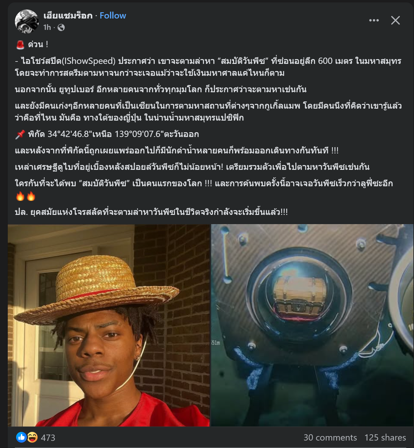 [RE: ด่วน ! IShowSpeed ประกาศว่า เขาจะตามล่าหา “สมบัติวันพีซ” ที่ซ่อนอยู่ลึก 600 เมตร]