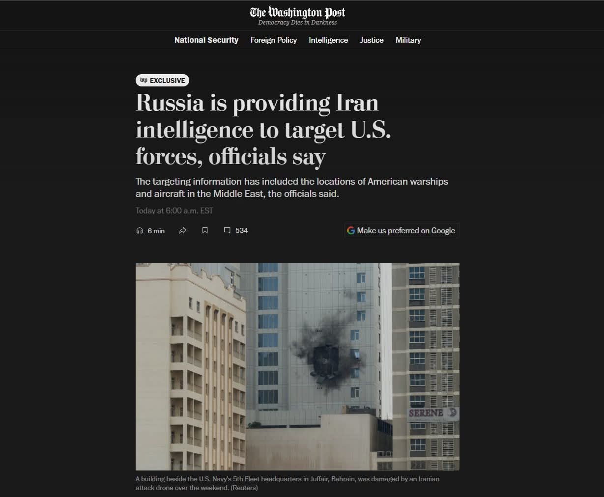 ทีใครทีมัน? The Washington Post รายงานแหล่งข่าวไม่เปิดเผยชื่อว่า รัสเซียส่งข้อมูลข่าวกรองให้อิหร่าน โจมตีเป้าหมายทางทหารสหรัฐฯ