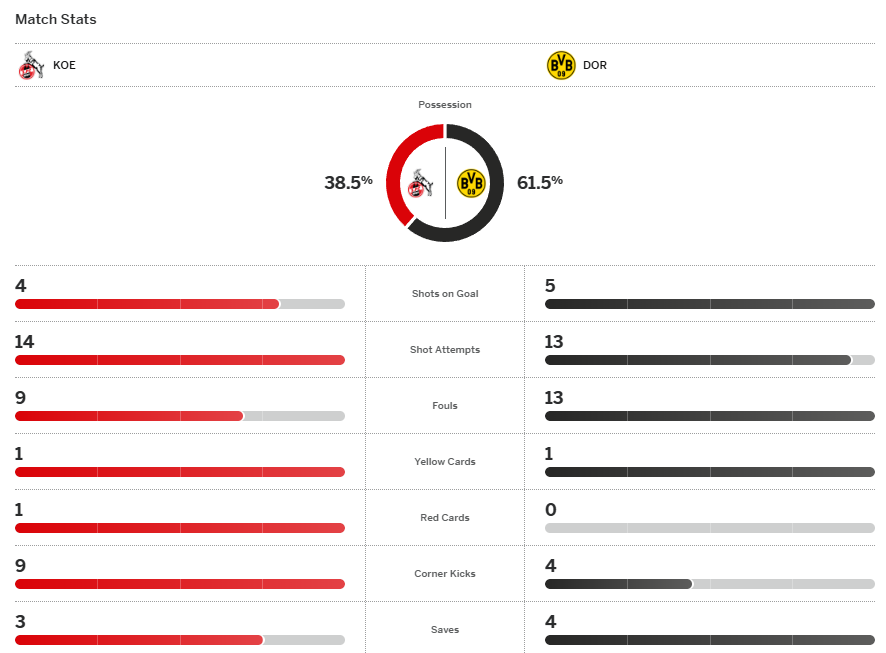จบเกม ดอร์ทมุนด์ ปราบ โคโลญจน์ ที่เหลือ 10 คน 2-1 เป็นการกลับมาคว้าชัยหลังสะดุดไป 2 เกมก่อนหน้านี้และกลับไปตามหลัง บาเยิร์น จ่าฝูงที่ 11 แต้มเท่าเดิม แต่ที่สำคัญกว่าคือการรักษาช่องว่างกับทีมอันดับ 3 แบบ ฮอฟเฟ่นไฮม์ ไว้ที่ 6 คะแนน