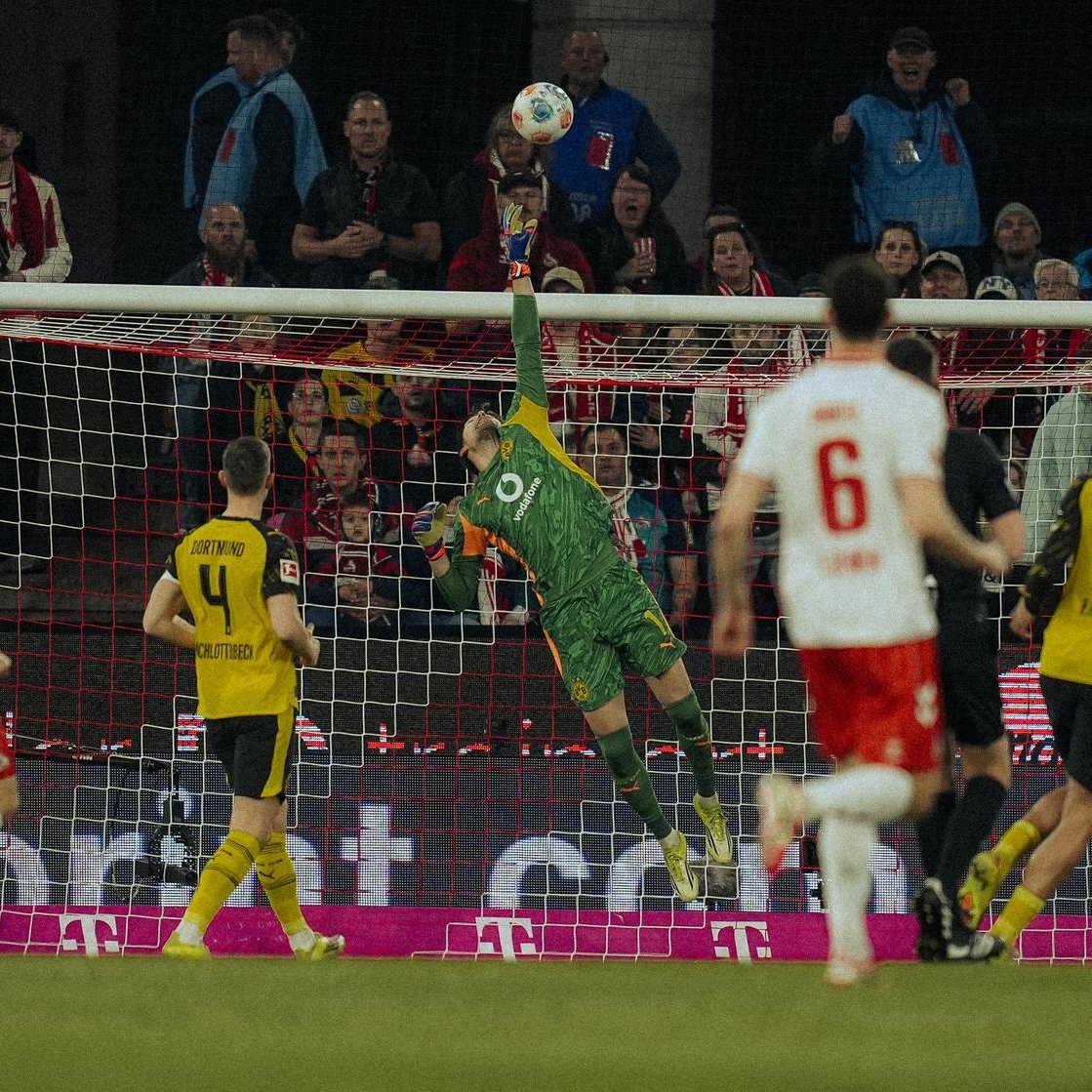จากนั้น ดอร์ทมุนด์ บุกมาแล้วก็ได้ประตูนำหลังเตะมุมเปิดเข้ามาโดนโหม่งสกัดออกไปหน้าเขตโทษ ไบเออร์ โหม่งกลับเข้าไปใหม่แล้ว กีราสซี่ ขยับตามไปดีดจ่อๆเข้าประตู ดอร์ทมุนด์ นำ 1-0