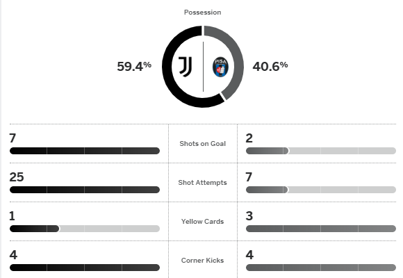 ยูเวนตุส อึดอัดจนนาที 54 เคนาน ยิลดิซ ครอสให้ อันเดรีย คัมเบียโซ่ โขกขึ้นนำแล้วไม่นานทิ้งห่างโดย เคเฟรน ตูราม จากนั้น ยิลดิซ ยิงเองบวกเพิ่มก่อนทดเจ็บ เจเรมี่ โบก้า ปิดกล่อง เปิดรังถล่ม ปิซ่า รองบ๊วย 4-0 กลับสู่เส้นทางหลังไร้ชัยในลีกมา 4 นัดติด จี้ท็อปโฟร์เหลือแต้มเดียวก่อน โรม่า ลงแข่ง