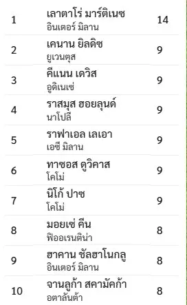 พึ่งสังเกตว่าดาวซัลโวของกัลโช่ฤดูกาลนี้น้อยกว่าลีกอื่นเกือบ 10 ประตู แถมมีคนเดียวที่ยิงเลข 2 หลัก