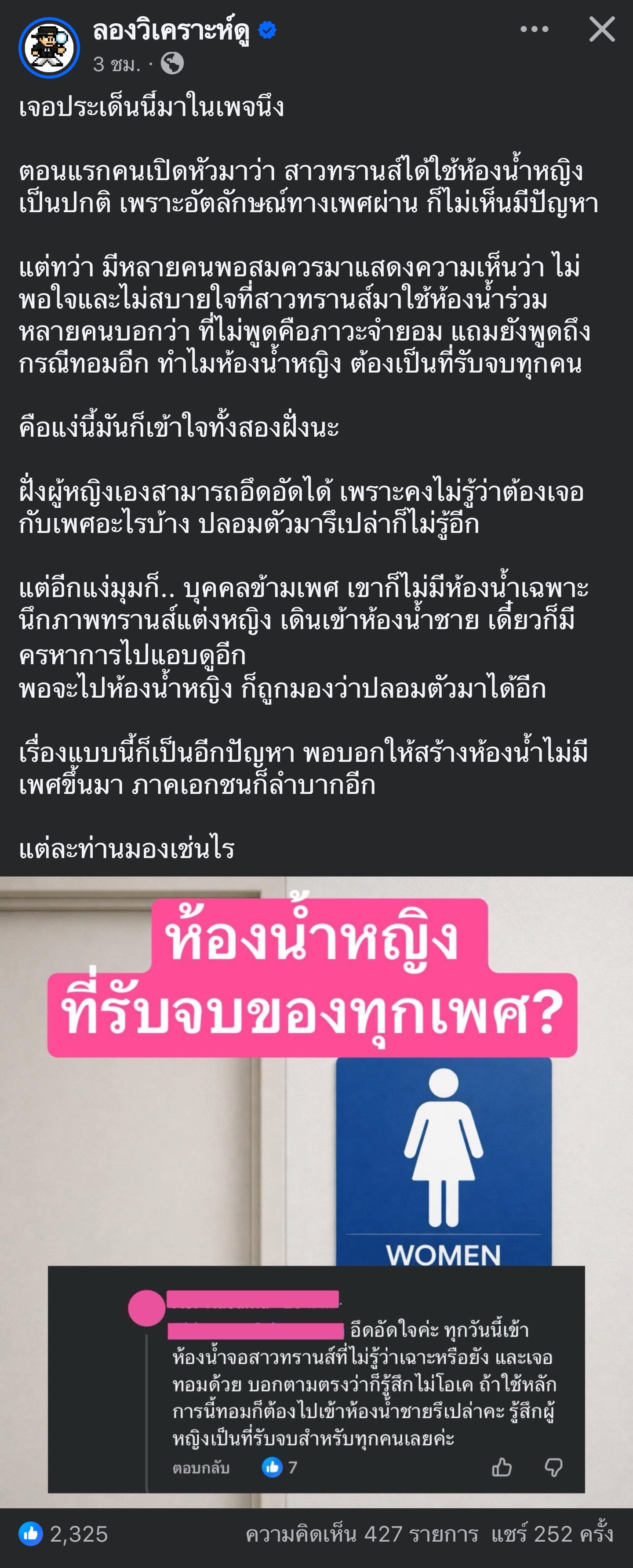 เคสนี้เห็นใจผู้หญิงเลย แล้วถ้าผมเป็นพ่อ ผมก็ห่วงลูกสาว ถ้าผมเป็นผัวผมก็กลัวห่วงเมียอ่ะ ถ้าเกิดจะมีทรานส์ที่ไม่รู้ว่าเฉาะไม่เฉาะมาเข้าห้องน้ำเดียวกัน