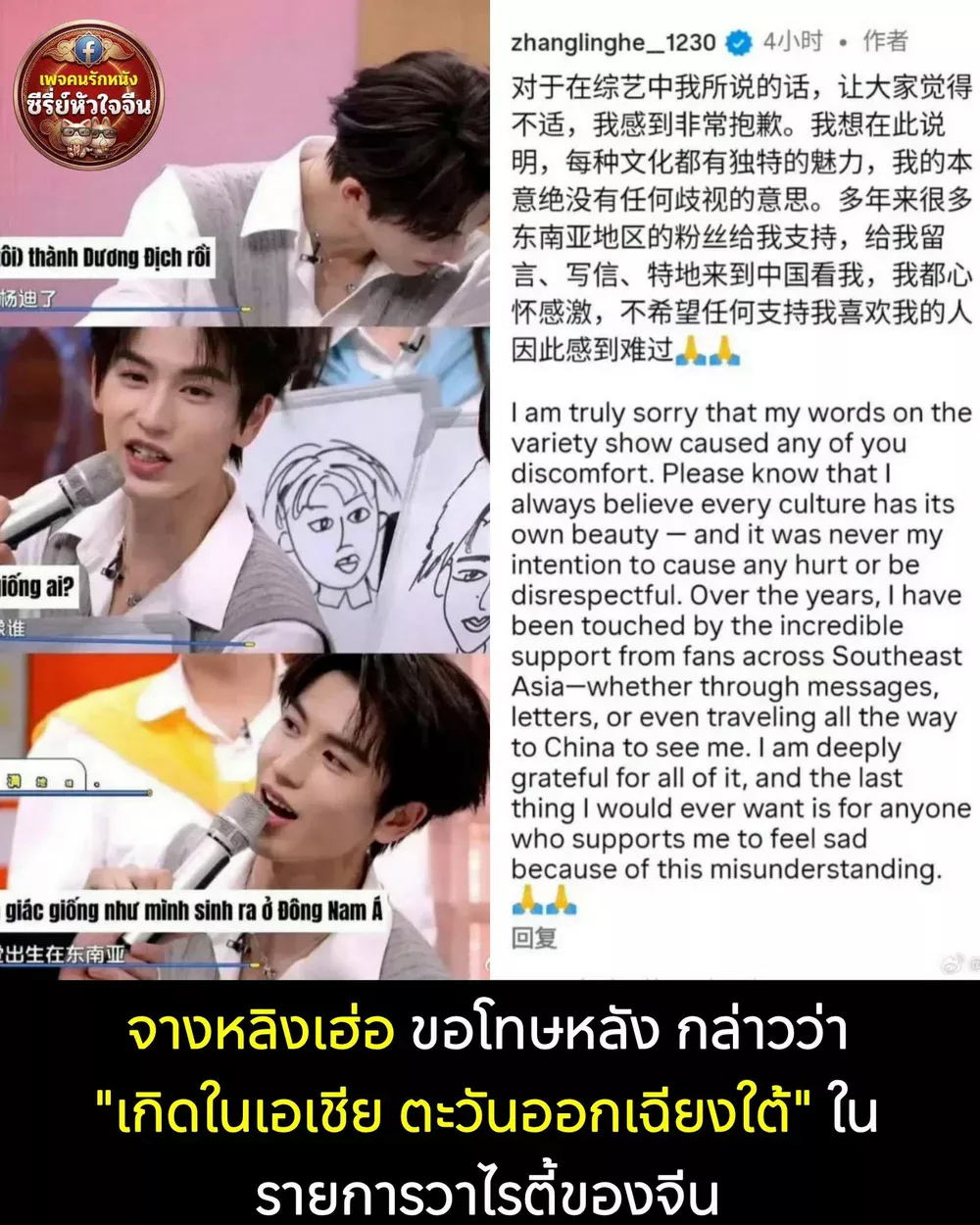 กลายเป็นประเด็นร้อนที่ถูกพูดถึงไปทั่วโซเชียล เมื่อพระเอกหนุ่มสุดฮอต #จางหลิงเฮ่อ ต้องเผชิญกระแสดราม่าครั้งใหญ่ หลังจากคำพูดในรายการวาไรตี้กลายเป็นไวรัลด้านลบ จนเจ้าตัวต้องออกมาโพสต์แถลงการณ์ขอโทษผ่าน Instagram ส่วนตัวอย่างเร่งด่วน เมื่อวันที่ 10 มีนาคม 2026
