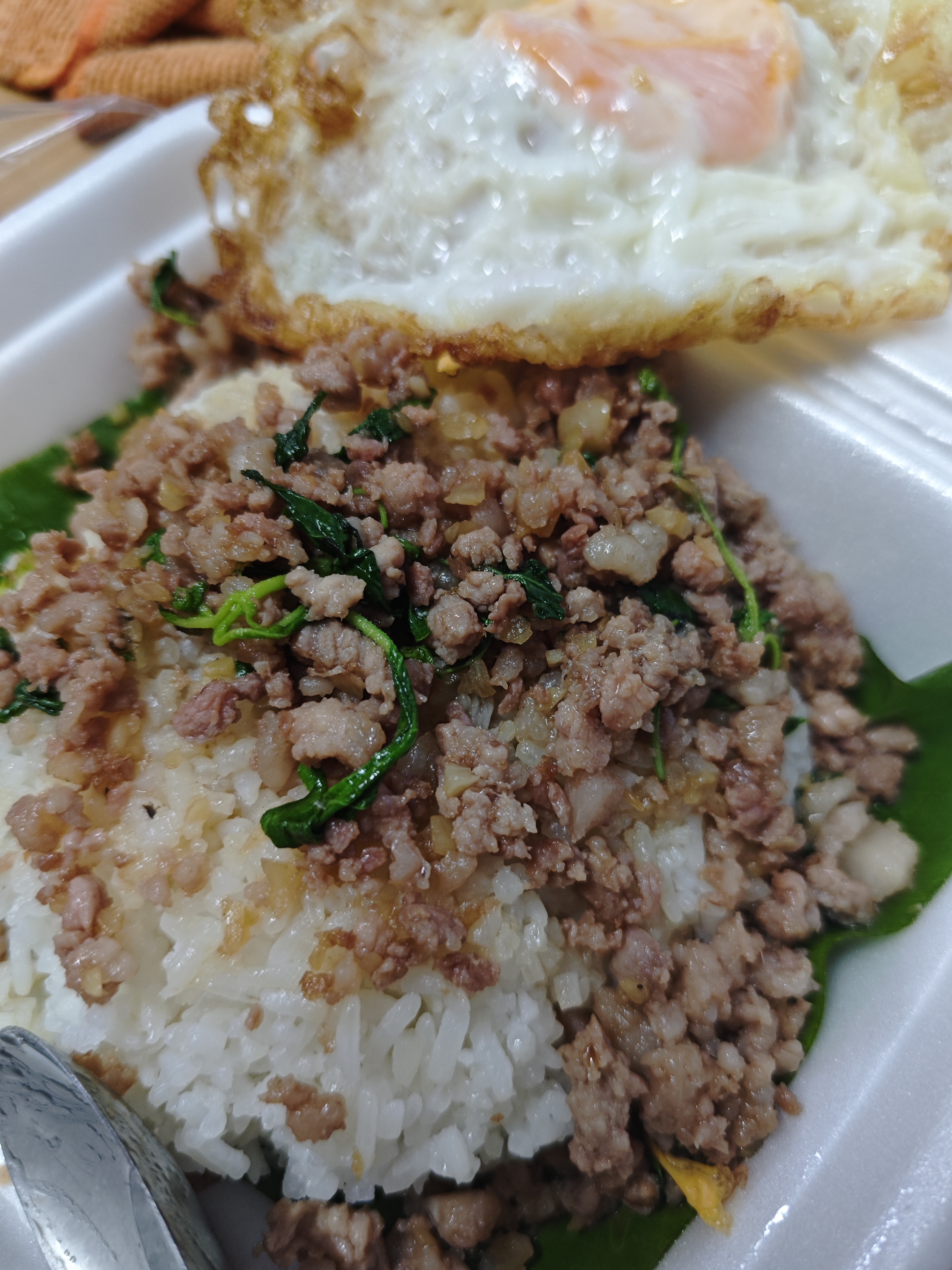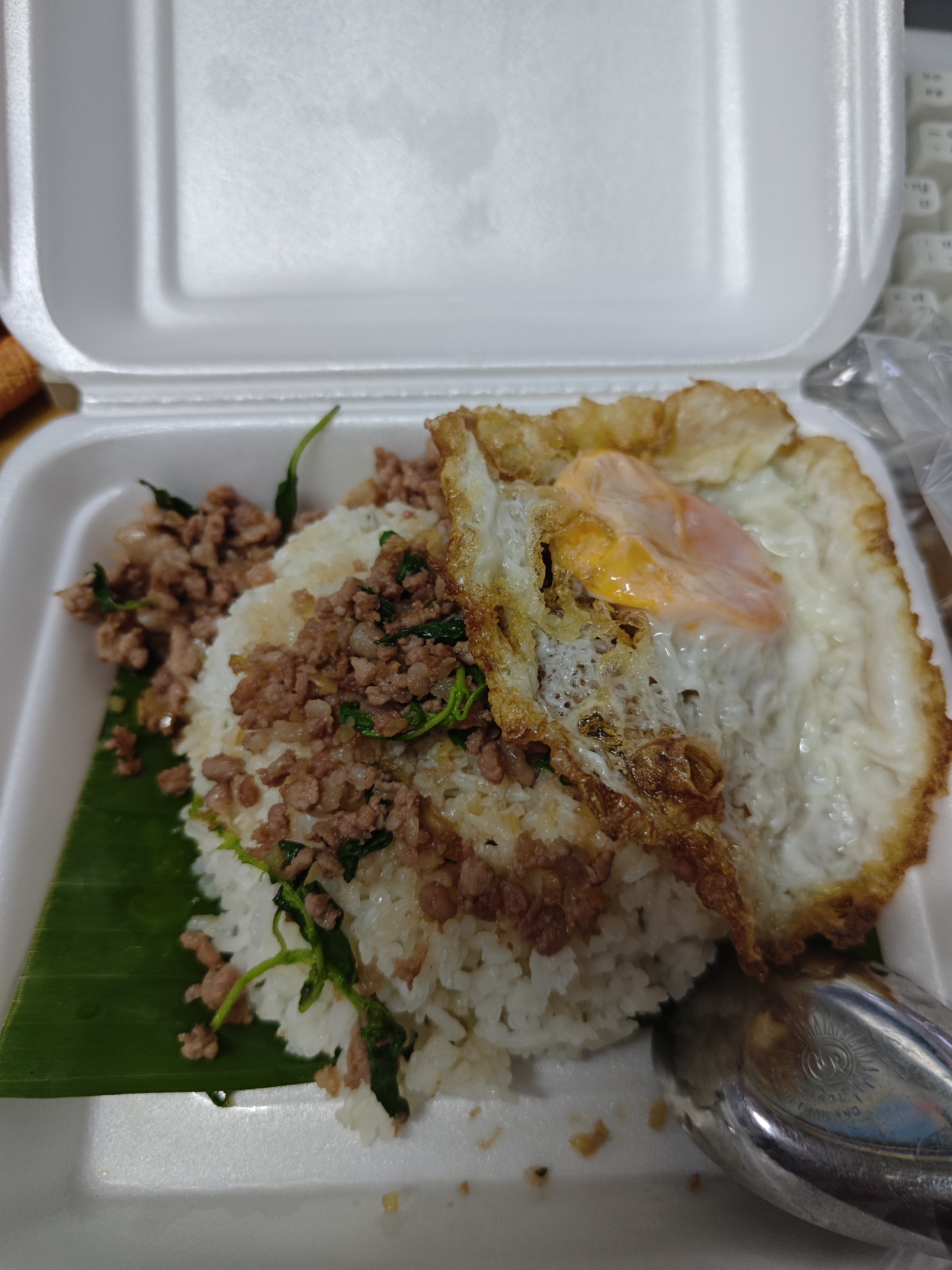 พอทำเสร็จแล้ว ก็เดินกลับยไปกินที่บ้านครับ ไม่ได้กินที่ร้านนะครับ ราคากล่องละ 45 บาทครับ พอเปิดดู ทำไมมันดูจืดๆแห้งๆจัง 55555 พอลองชิมแล้ว โอโหห จืดเหมือนหน้าตาจริงๆครับ คือน้ำกะเพราไม่ค่อยมี รสชาติค่อนข้างออกไปทางจืดเลย คนรักสุขภาพน่าจะชอบนะ แต่ๆภาพรวมผมกลับโอเคนะ กินได้ ค่อนข้างชอบเลย ปกติกะเพราแถวบ้านผมมักมีรสจัดถึงกลางๆ ร้านนี้คือจืดที่สุดจริงๆครับ ถ้าให้คะแนนก็สัก 8/10 ละกันครับ