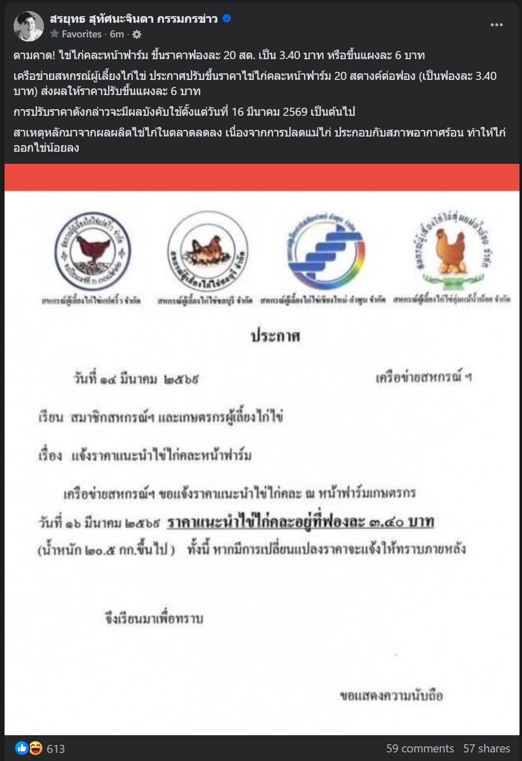 [RE: ตามคาด! ไข่ไก่คละหน้าฟาร์ม ขึ้นราคาฟองละ 20 สต. เป็น 3.40 บาท หรือขึ้นแผงละ 6 บาท]