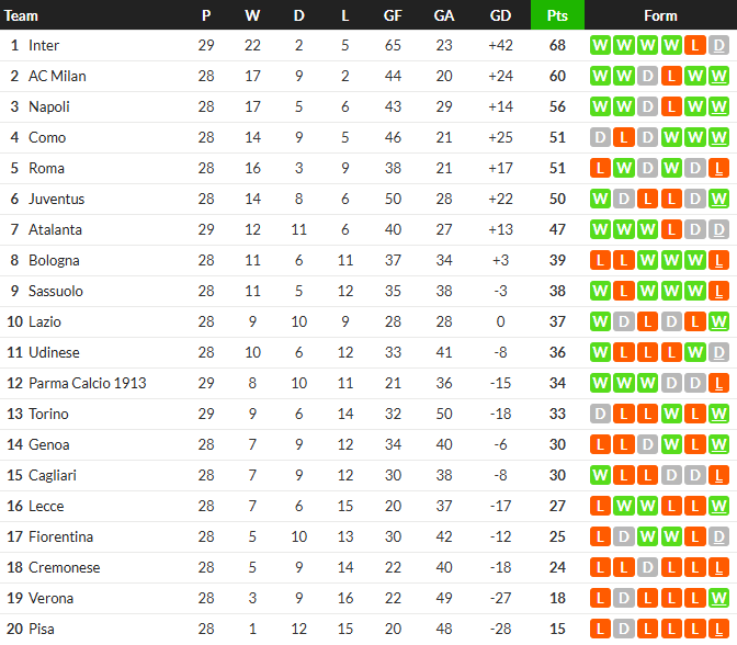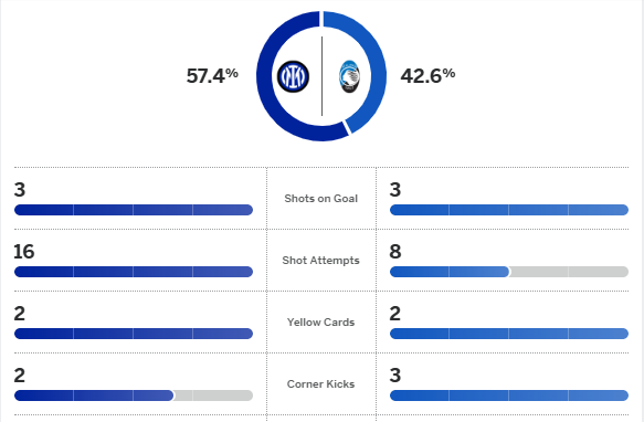 อินเตอร์ มิลาน รูปเกมเหนือกว่าได้ ปิโอ เอสโปซิโต้ ยิงขึ้นนำกลางครึ่งแรก จากนั้นมีโอกาสบวกเพิ่มหลายครั้งแต่ทำไม่ได้ จนนาที 82 อตาลันต้า ทวงคืนในจังหวะปัญหาที่ คริสเตียน คิวู ประท้วงหนักโดนใบแดง จ่าฝูง เซเรีย อา เปิดบ้านเสมอ 1-1 ไร้ชัย 3 นัดติด นำ 8 คะแนนก่อน เอซี มิลาน ผู้ตามลงแข่ง