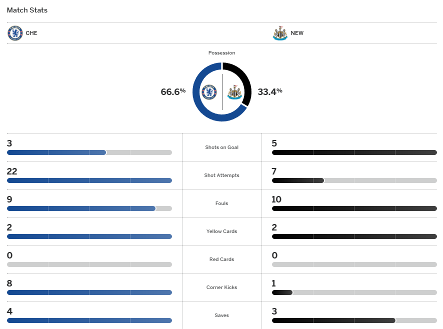 แนวรับของ เชลซี ไปเปิดช่องให้ นิวคาสเซิ่ล ยูไนเต็ด เอาประตูนำก่อนจาก แอนโธนี่ กอร์ดอน เลยกลายเป็นงานยากหลังจากนั้นแม้พวกเขาได้โอกาสเท่าไหร่แต่ก็เอาประตูที่ต้องการไม่ได้ซึ่งรวมถึง รีซ เจมส์ ยิงฟรีคิกชนเสาช่วงทดเจ็บทำให้ สิงห์บลูส์ แพ้คาบ้านต่อ สาลิกาดง 1-0 ยังอยู่อันดับ 5 แต่แต้มยังเท่า ลิเวอร์พูล ที่ยังไม่ลงสนาม