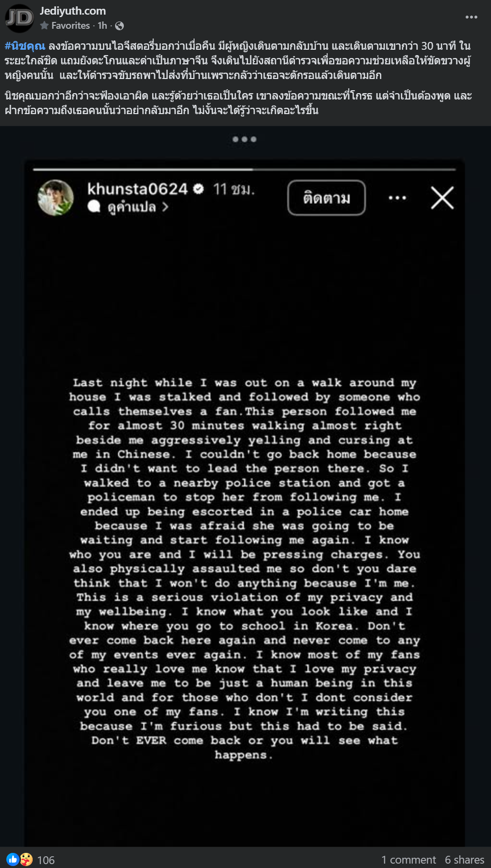 นิชคุณ โดนผู้หญิงตาม แถมยังตะโกนและด่าเป็นภาษาจีน ยืนยันจะฟ้องเอาผิด