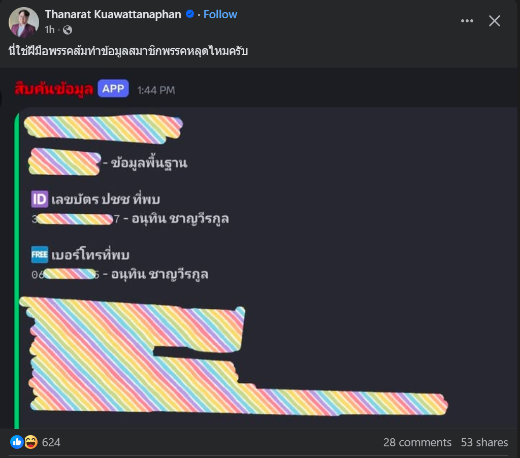 ผมว่าข้อมูลผมก็หลุดได้ อย่างน้อยไปสมัครเน็ต ซิมมือถือ กรอกข้อมูล ส่งสำเนาหน้าบัตรให้เขา เอกชนก้มีข้อมูลแล้วครับ หรือถ้าพนักมันแอบถ่าย ได้ข้อมูลตามนี้ไม่ยาก แล้วนายกจะไม่เคยไปทำธุรกรรมแบบเราหรือ ทั้งตอนดังแล้วหรือยังไม่ดัง