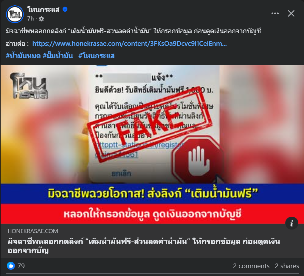 Re: มิจฉาชีพหลอกกดลิงก์ “เติมน้ำมันฟรี-ส่วนลดค่าน้ำมัน” ให้กรอกข้อมูล ก่อนดูดเงินออกจากบัญชี