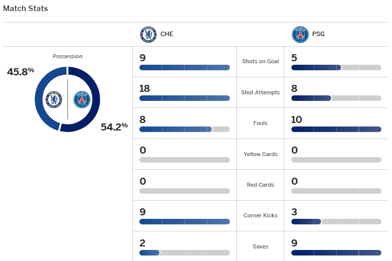 ปารีส แซงต์-แชร์กแมง ยังไร้เทียมทานโดยเฉพาะเกมรุกที่บุกทีได้ลุ้นตลอด สวนทางกับ เชลซี ที่เกมรับเปื่อยยุ่ย โดนเจาะเป็นหลุด แล้วกลายเป็นทีมดังจากฝรั่งเศสที่ถล่มแบบไม่ไว้หน้า 3-0 คาถิ่นสแตมฟอร์ด บริดจ์ โดยได้ประตูจาก ควิช่า ควารัตสเคเลีย, แบรดลี่ย์ บาร์โคล่า และ เซนนี่ มายูลู รวมผลสองนัดถล่มเละเทะ 8-2