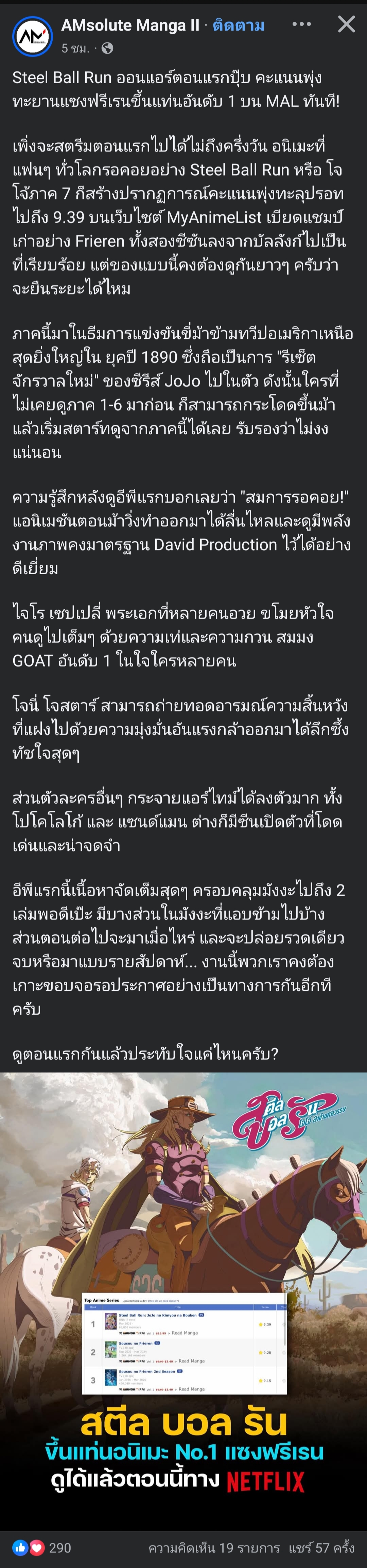 สตีล บอล รัน ขึ้นแท่นอนิเมะ อันดับ 1 แซงฟรีเรน หลังฉายตอนแรก