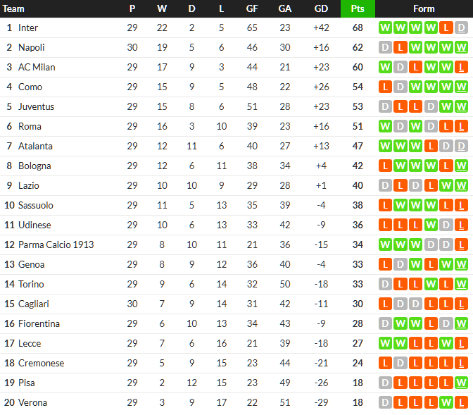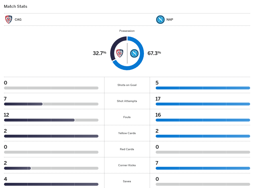 จบเกม นาโปลี เฉือนชนะ กาญารี่ 1-0 กวาดชัยชนะ 4 นัดรวดในลีกและขยับขึ้นมาเป็นรองจ่าฝูงตามหลัง อินเตอร์ 6 คะแนน