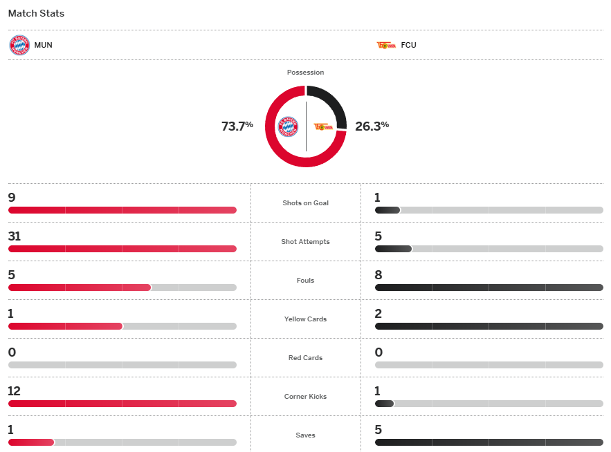 จบเกม บาเยิร์น ไร้ปัญหาเอาชนะ อูนิโอน 4-0 กลับมาคว้าชัยหลังนัดก่อนเสมอ เลเวอร์คูเซ่น และทำให้พวกเขาขึ้นมานำฝูงที่ 12 แต้มเป็นการชั่วคราว