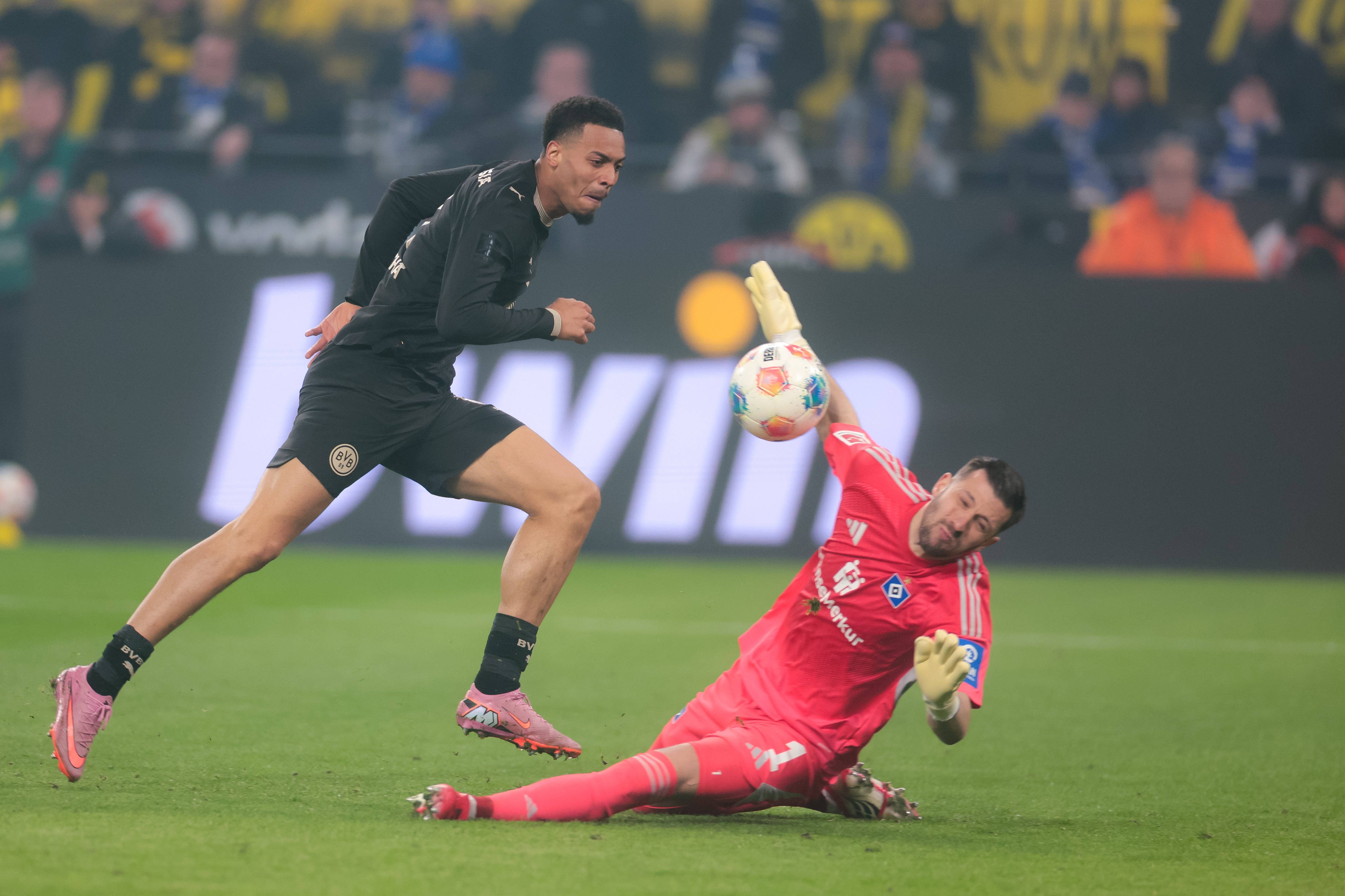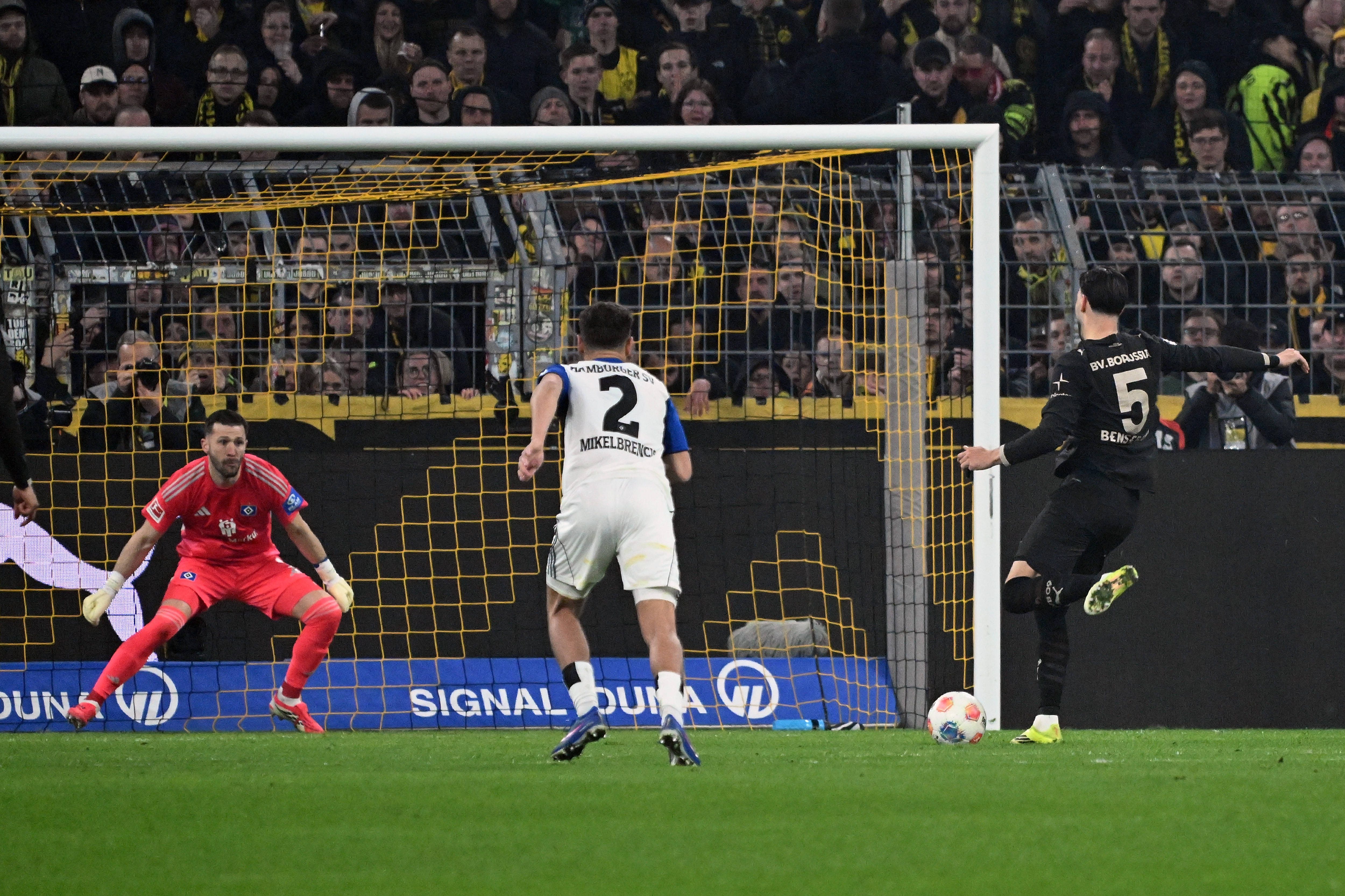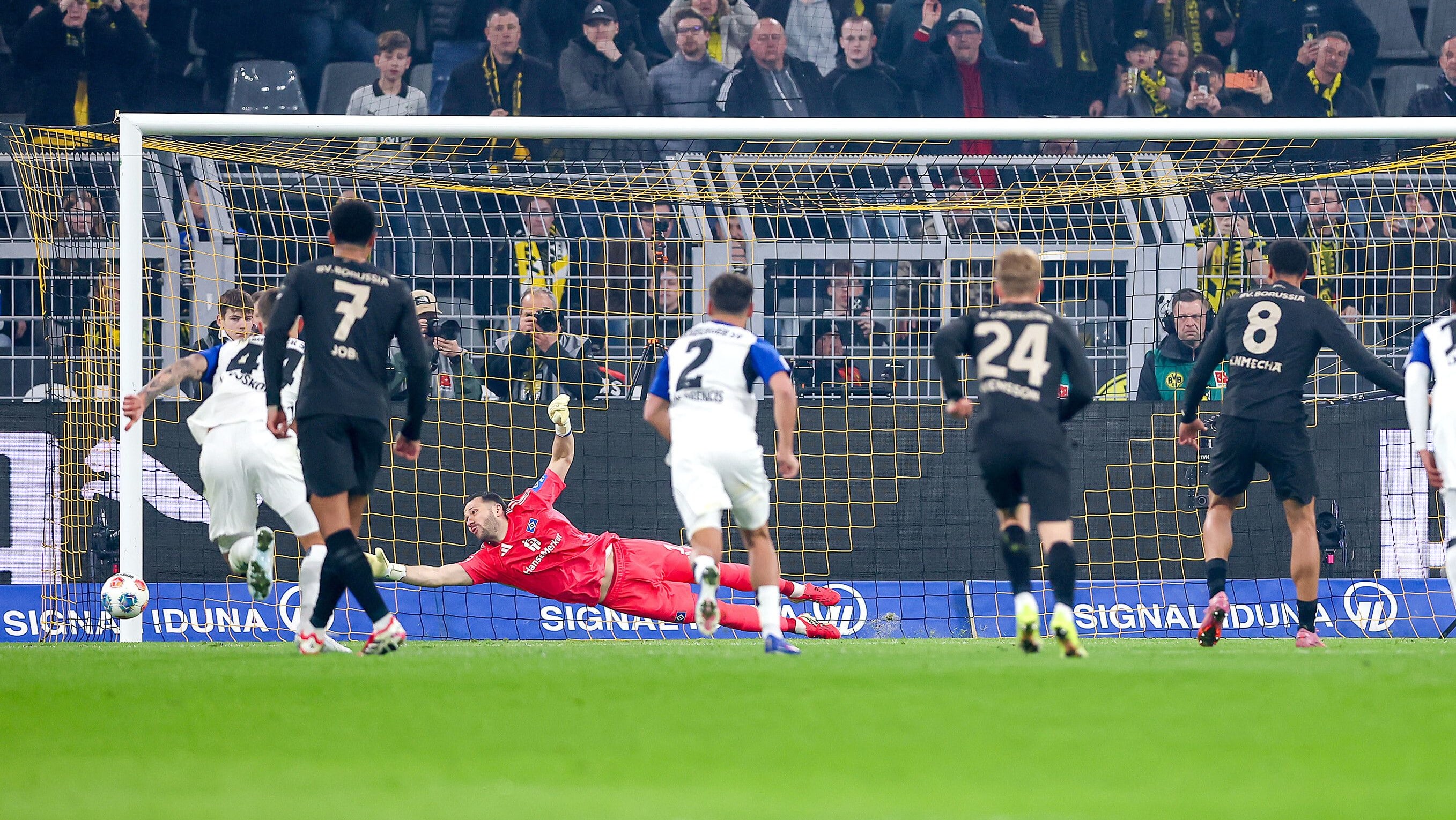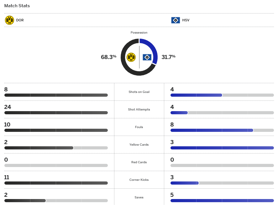นึกว่าจะไม่รอดเสียแล้วสำหรับ โบรุสเซีย ดอร์ทมุนด์ ที่พลาดจนโดนนำไป 0-2 แถมท้ายครึ่งแรก เฟลิกซ์ เมช่า ยังยิงจุดโทษไม่เข้าอีก ถึงอย่างนั้นพอเข้าครึ่งหลังกลายเป็น เสือเหลือง คัมแบ็คได้ รามี่ เบนเซไบนี่ ยิงสองจุดโทษรวมถึง เซห์รู กีราสซี่ อีกประตูแซงกลับมาเฉือน ฮัมบวร์ก หวุดหวิด 3-2