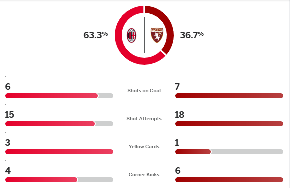 สตราฮินย่า พาฟโลวิช ซัดไกลสุดสวยขึ้นนำก่อนโดนตีเสมอท้ายครึ่งแรก แล้วครึ่งหลัง อาเดรียน ราบิโอต์ กับ ยุสซุฟ โฟฟาน่า สองมิดฟิลด์ฝรั่งเศสรัวยิงนาที 54 และ 56 แม้ช่วงท้าย โตริโน่ ตีตื้นด้วยจุดโทษ เอซี มิลาน ยังรักษาสกอร์เปิดรังเฉือน 3-2 กลับสู่เส้นทางชัยชนะ ทวงตำแหน่งรองจ่าฝูง เซเรีย อา