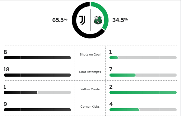 เคนาน ยิลดิซ ผลิตสกอร์ขึ้นนำนาที 14 จากนั้น ยูเวนตุส มีโอกาสทิ้งห่างทำไม่ได้ จนต้นครึ่งหลังโดน อันเดรีย ปินามอนติ ยิงคืน และแม้ช่วงท้ายได้จุดโทษแต่ มานูเอล โลคาเตลลี่ สังหารติดเซฟ ทำได้แค่เปิดบ้านเสมอ ซาสซูโอโล่ 1-1 พลาดโอกาสแซง โคโม่ ขึ้นท็อปโฟร์ เซเรีย อา