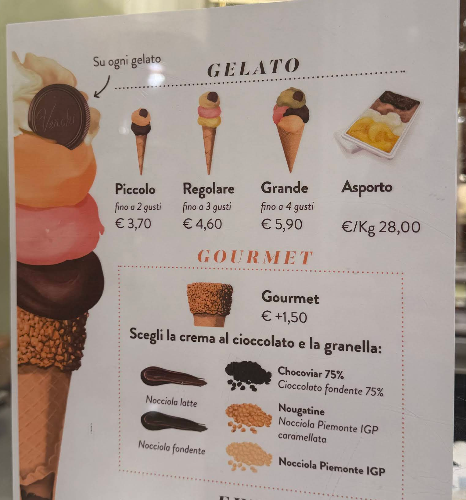 #เป็นร้านไอศกรีมที่ห้ามพลาด พบเจอหลายที่ในอิตาลี สาขาเยอะมาก โดยร้านนี้เมนูที่คนส่วนมากซื้อทานคือ ไอศกรีมโคน (สามารถใส่toppingเพิ่มเติมที่ขอบโคนได้) แต่แนะนำให้เคลือบช็อกโกแลต ซึ่งเป็นช็อกโกแลตสดๆเลย ก่อนใส่ถั่ว/แอลมอนด์ หรือช็อกโกแลตชิป