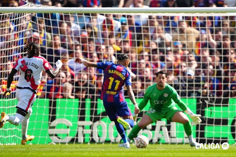 บาร์ซ่าน่าได้ก่อนจาก ราฟินญ่า อาศัยความผิดพลาดของ ราโย ควบบอลหลุดเข้าไปยิงถากเสาไกลนิดเดียว