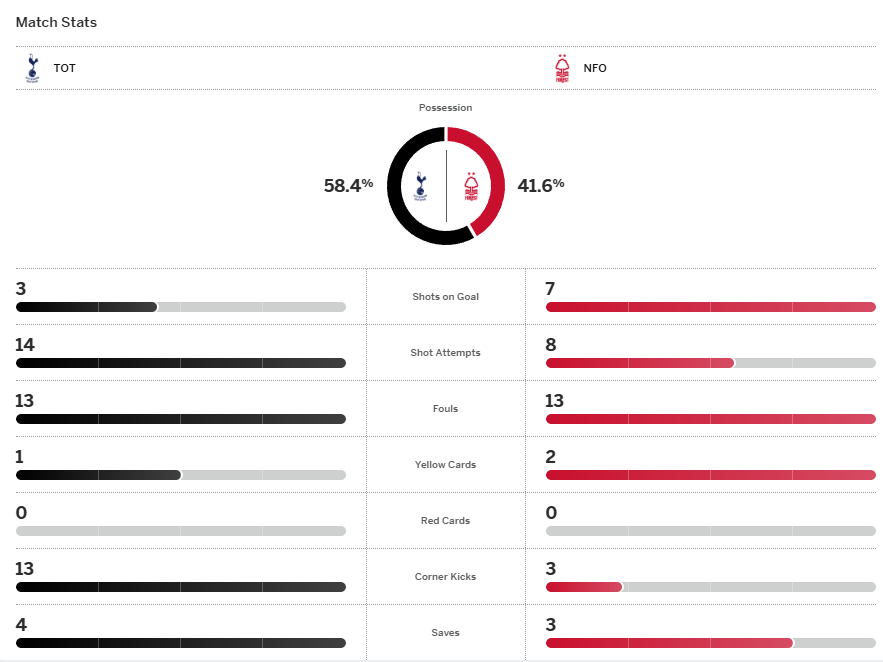 ท็อตแน่ม ฮอทสเปอร์ เหมือนจะฟื้นแต่ไม่ฟื้นโดนน็อตติ้งแฮม ฟอเรสต์ ที่คมกว่ายิงเป็นตุงเริ่มจากอีกอร์ เชซุสก่อนมอร์แกน กิ๊บบ์ส-ไวท์ และไตโว่ อโวนิยี่ มาบวกอีกคนละตุงครึ่งหลังพา เจ้าป่า หนีห่างโซนตกชั้น 3 คะแนน ส่วนทีมของอีกอร์ ทูดอร์ เหนือโซนหนีตายแต้มเดียวเหมือนเดิม