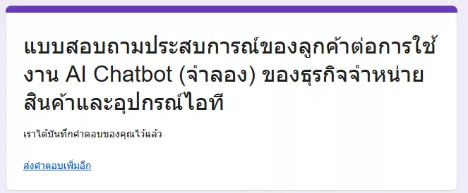 2.หลังจากลองทดสอบการใช้งานแชทบอท(จำลอง) เสร็จแล้ว รบกวนช่วยทำแบบสอบถามเกี่ยวกับประสบการณ์ในการใช้งานแชทบอทจำลอง ผ่านลิ้ง “