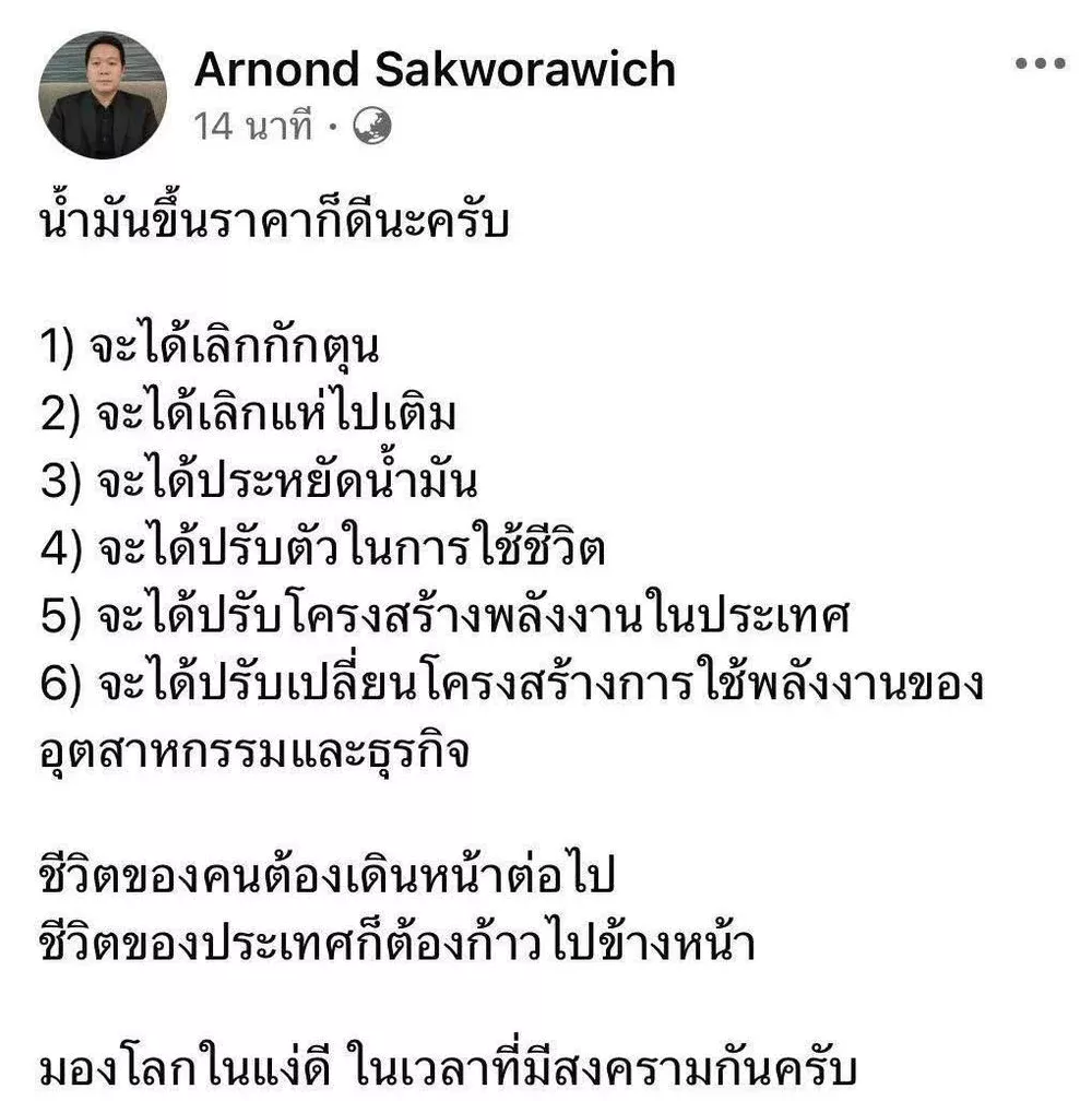 [RE: พรี่ลูกบิด เห็นด้วยที่น้ำมันขึ้นราคา พร้อมบอกให้คนไทยต้องปรับตัว ชีวิตต้องเดินไปข้างหน้า ประเทศต้องเดินไปข้างหน้า ในช่วงสงครามนี้]