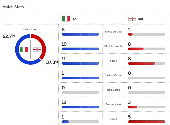ช่วงเวลาที่เหลือ อิตาลีเอาอยู่ จบเกมไม่มีปัญหา พวกเขาเอาชนะไอร์แลนด์เหนือ 2-0 ผ่านเข้าสู่รอบชิงชนะเลิศต่อไป