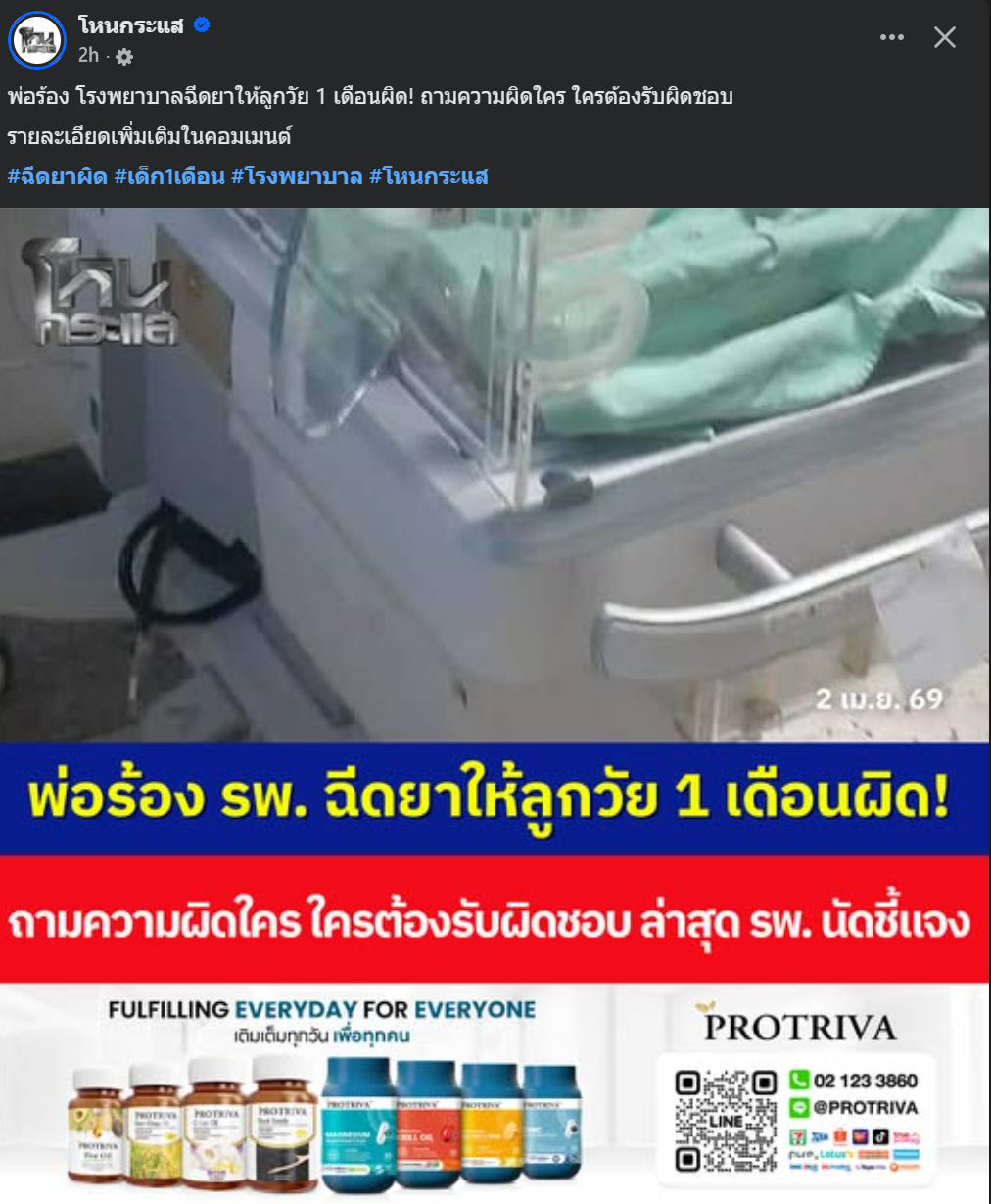 พ่อร้อง รพ. ฉีดยาให้ลูกวัย 1 เดือนผิดขนาด ฉีดขนาดผู้ใหญ่ให้