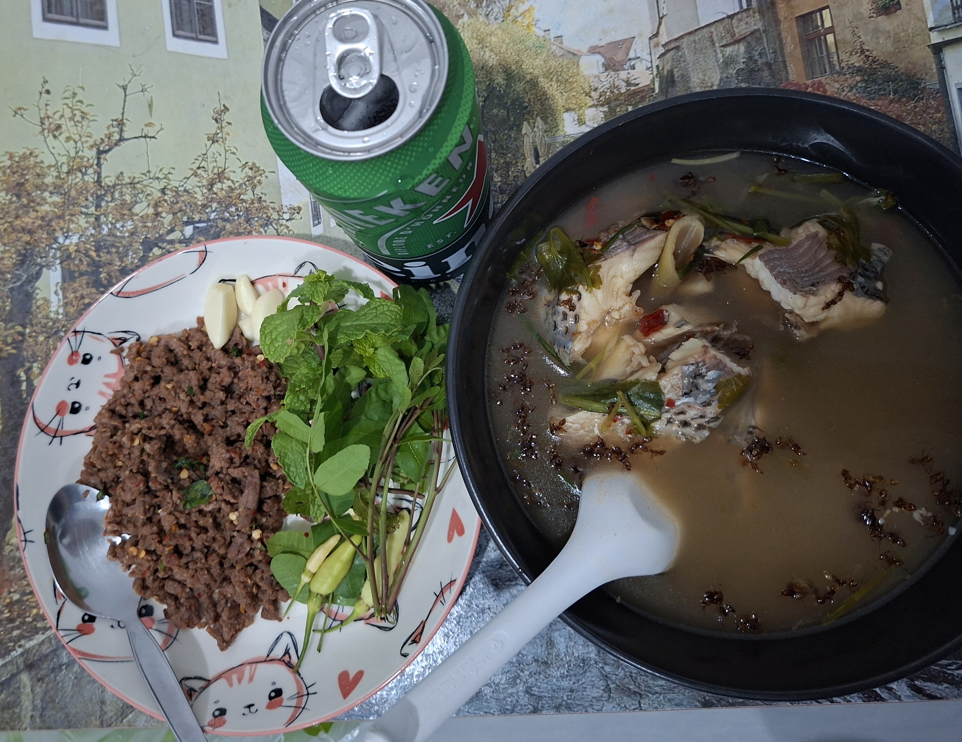 ต้มปลาใส่มดแดง ก้อยเนื้อคั่ว