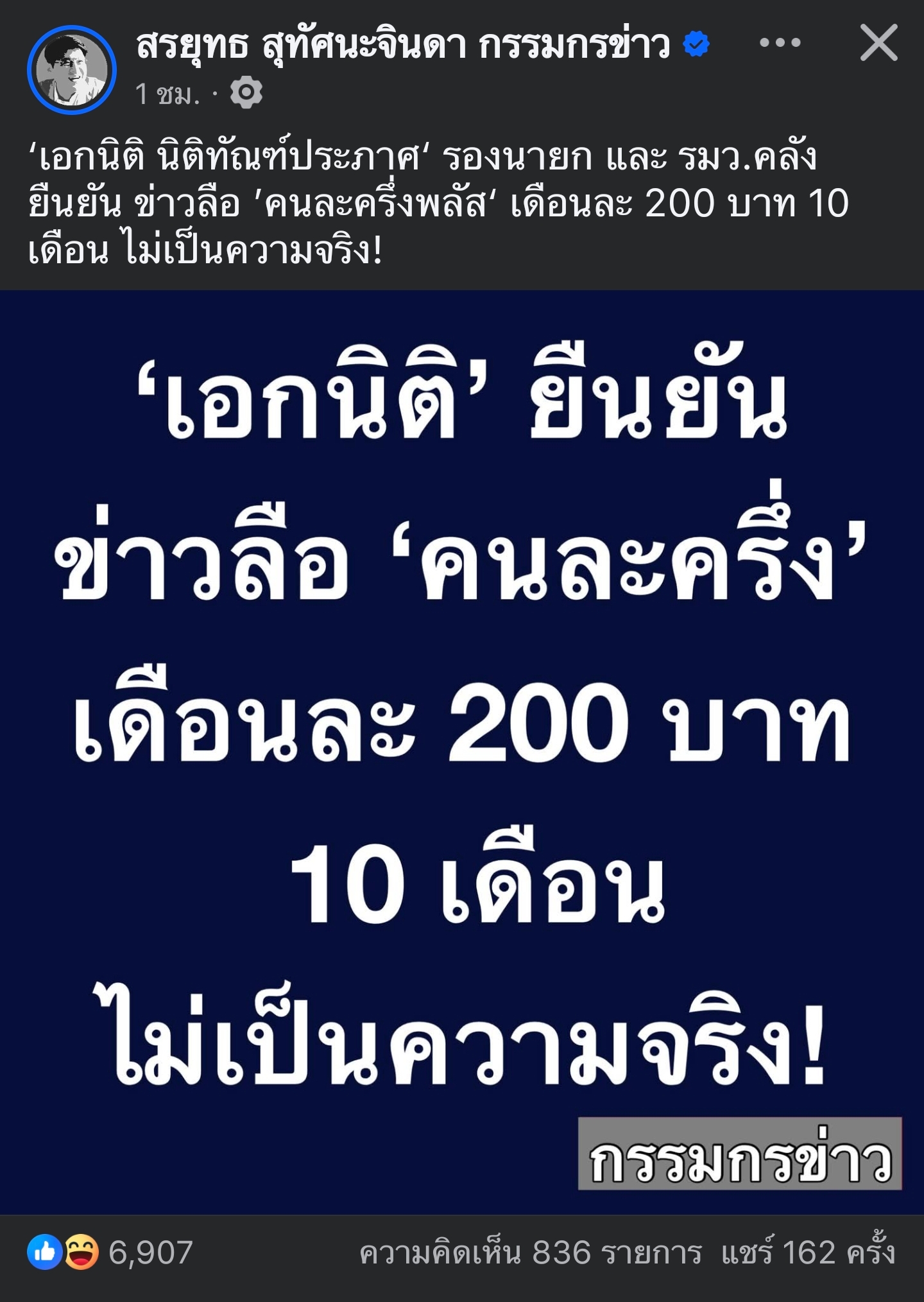 Re: เอกนิติยืนยัน ข่าวลือคนละครึ่งเดือนละ 200 บาท 10 เดือน ไม่เป็นความจริง