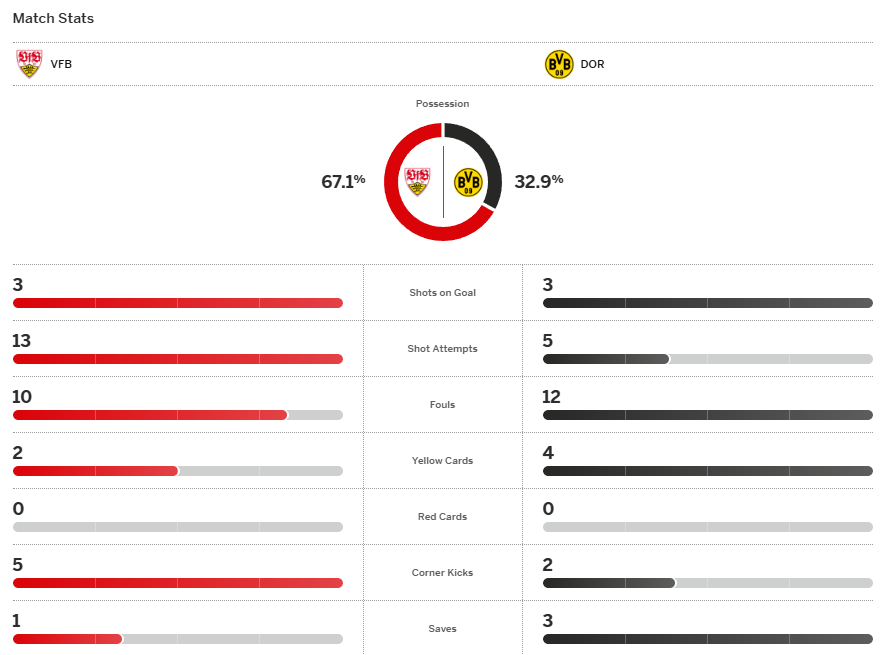 จบเกม ดอร์ทมุนด์ เอาชนะ สตุ๊ตการ์ท 2-0 ทำให้พวกเขากวาดชัย 4 เกมรวดในลีกและรักษารองฝูงเหนียวแน่นขึ้นนำหน้า สตุ๊ตการ์ท เพิ่มเป็น 11 แต้มโดยที่เหลือเกมให้ลงสนามอีก 6 นัดเท่านั้น