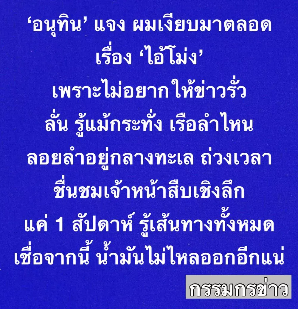 วันที่ 4 เม.ย.69 เวลา 15.20 น. ที่โลตัส บางกะปิ นายอนุทิน ชาญวีรกูล นายกรัฐมนตรีและรัฐมนตรีว่าการกระทรวงมหาดไทย ตอบคำถามถึงความคืบหน้ากรณีน้ำมันหายระหว่างขนส่งทางเรือ 57 ล้านลิตร ว่า ขณะนี้ทุกหน่วยงานดำเนินการขยายผล และดำเนินคดีกับผู้ที่ค้ากำไรเกินควร รวมไปถึงผู้ที่กักตุนน้ำมัน เพราะเป็นการกระทำที่ผิดกฎหมาย การที่ได้ตรวจสอบพบ ถือเป็นการที่ทำให้เราควบคุมปริมาณน้ำมันที่ออกจากโรงกลั่น เพราะต้องการให้น้ำมันจากโรงกลั่นทุกลิตร ไปถึงมือพี่น้องประชาชน และสถานีบริการน้ำมันต่างๆ ไม่ใช่นำไปกักตุนเอาไว้เพื่อเก็งกำไร แบบนั้นทำไม่ได้ ต้องชื่นชมเจ้าหน้าที่บ้านเมือง สามารถลงไปสืบได้ในเชิงลึก