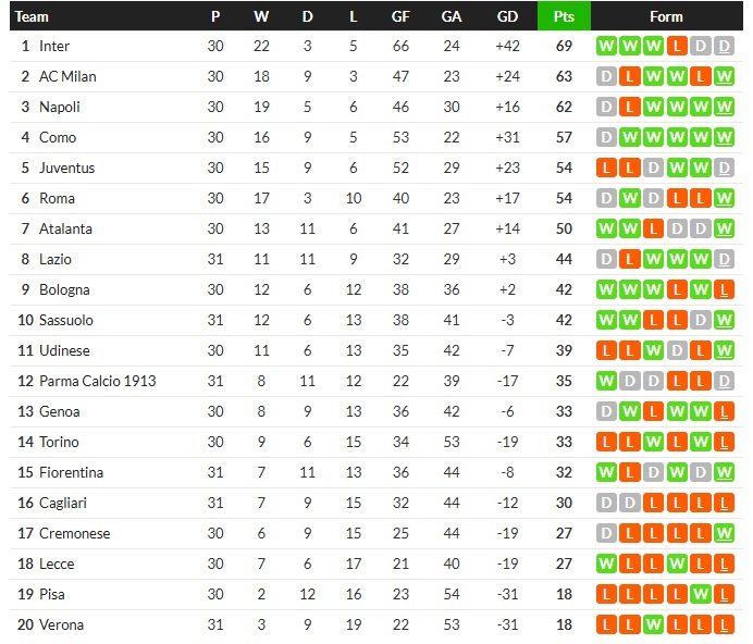 อินเตอร์ มิลาน นำเป็นจ่าฝูงเซเรีย อา โดยมีคะแนนนำเอซี มิลาน ทีมอันดับสองอยู่ 6 คะแนน ส่วนโรม่ากำลังลุ้นแย่งโควต้าไปเล่นแชมเปี้ยนส์ลีก และมีคะแนนตามหลังโคโม่ ทีมอันดับ 4 อยู่ 3 คะแนน