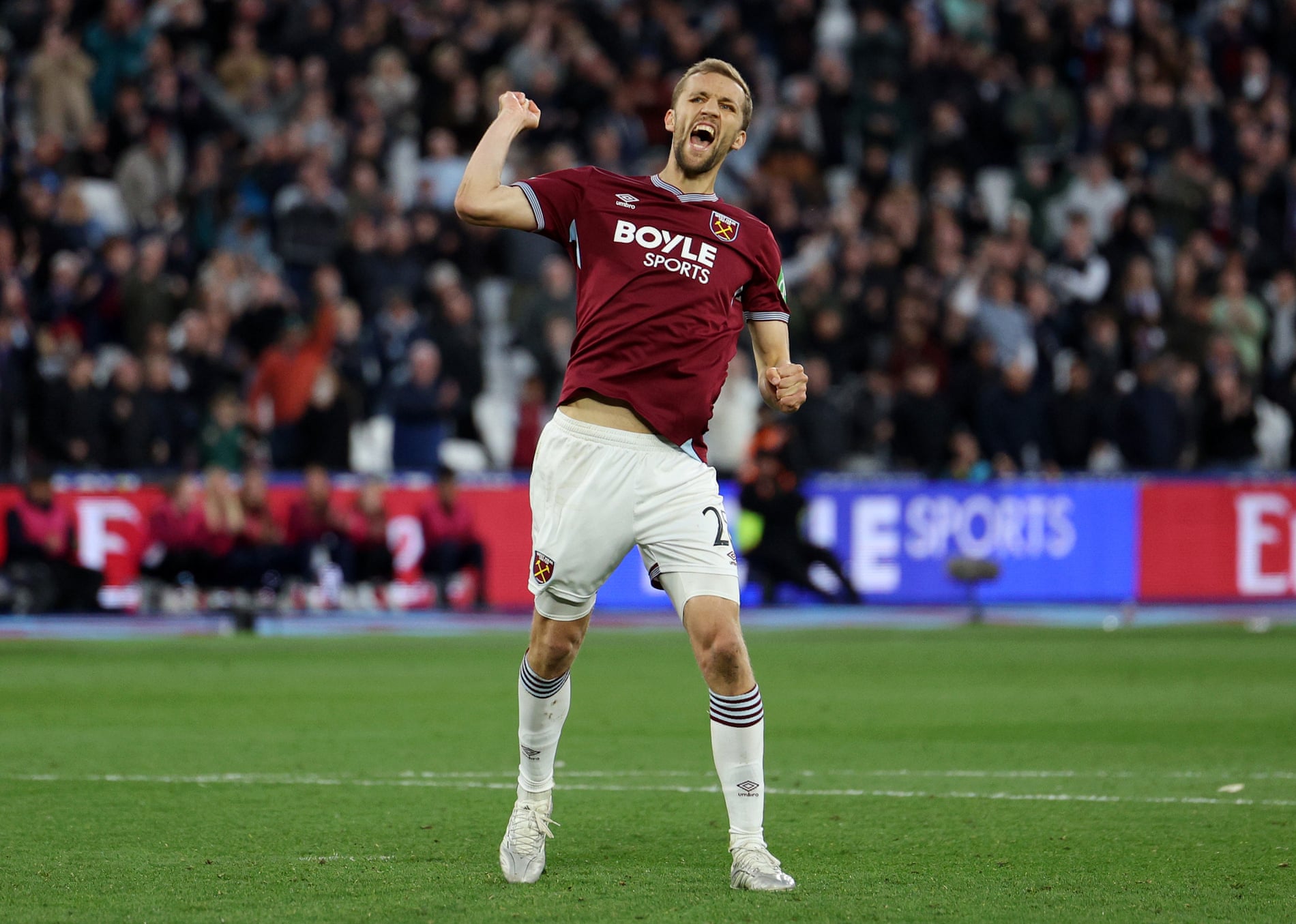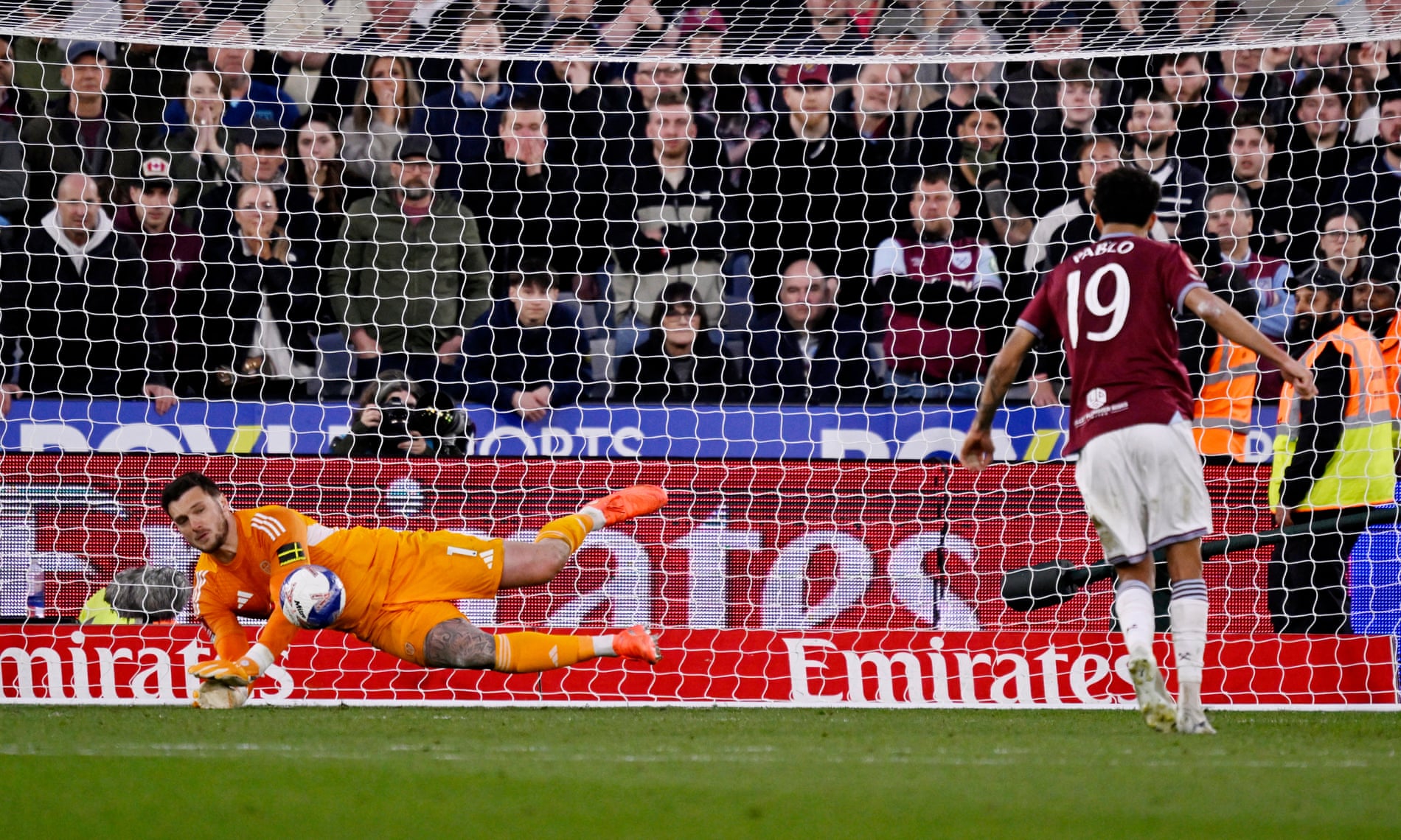 ทดเจ็บนาน 11 นาทียังพอมีเวลาให้ เวสต์แฮม ไล่ตามและก็ได้โอกาสเกือบตีไข่แตกจากลูกครอสทางซ้ายเปิดเข้าไปแล้ว ปาโบล เสาแรกโหม่งได้ส่งบอลหลุดกรอบออกไป