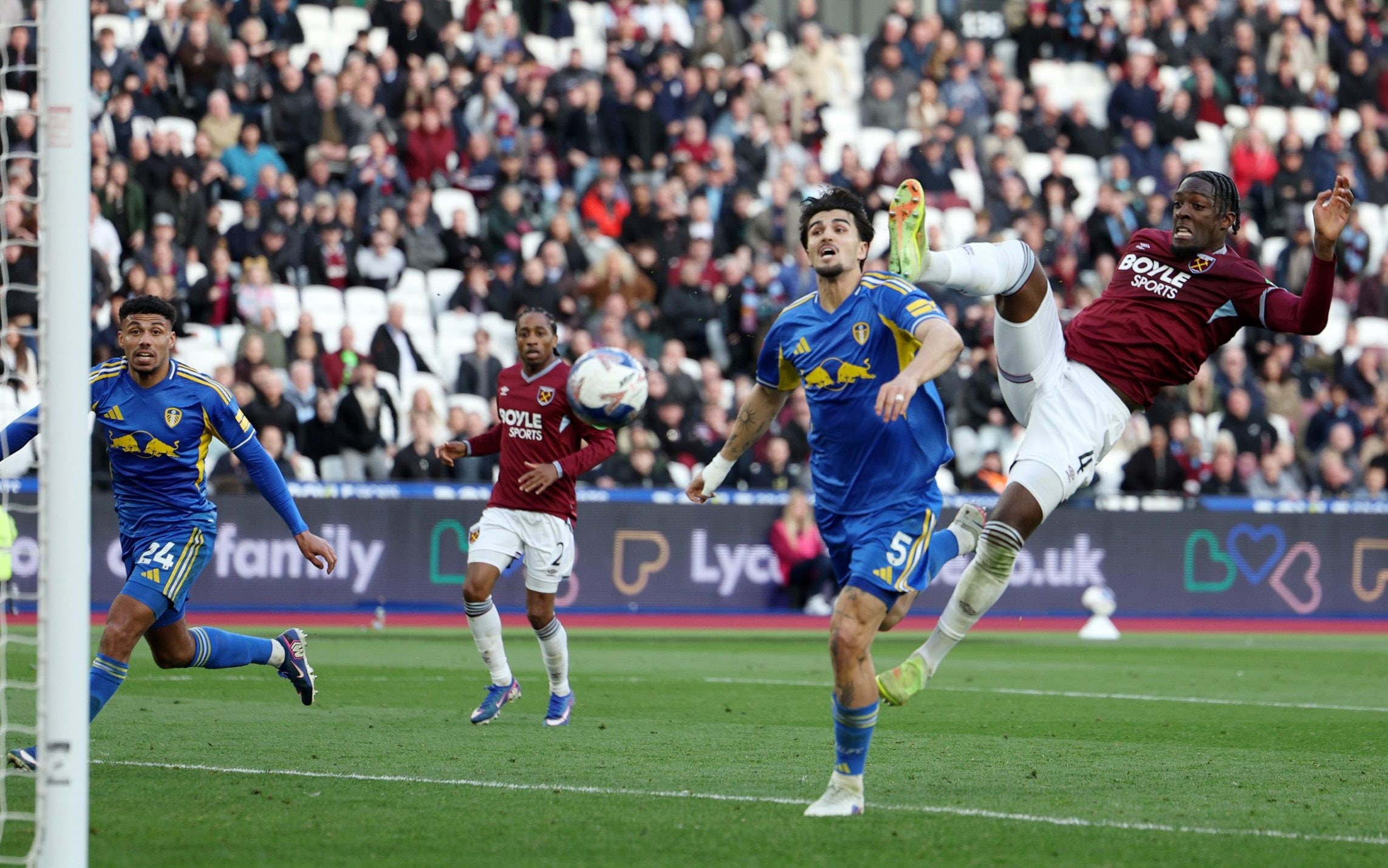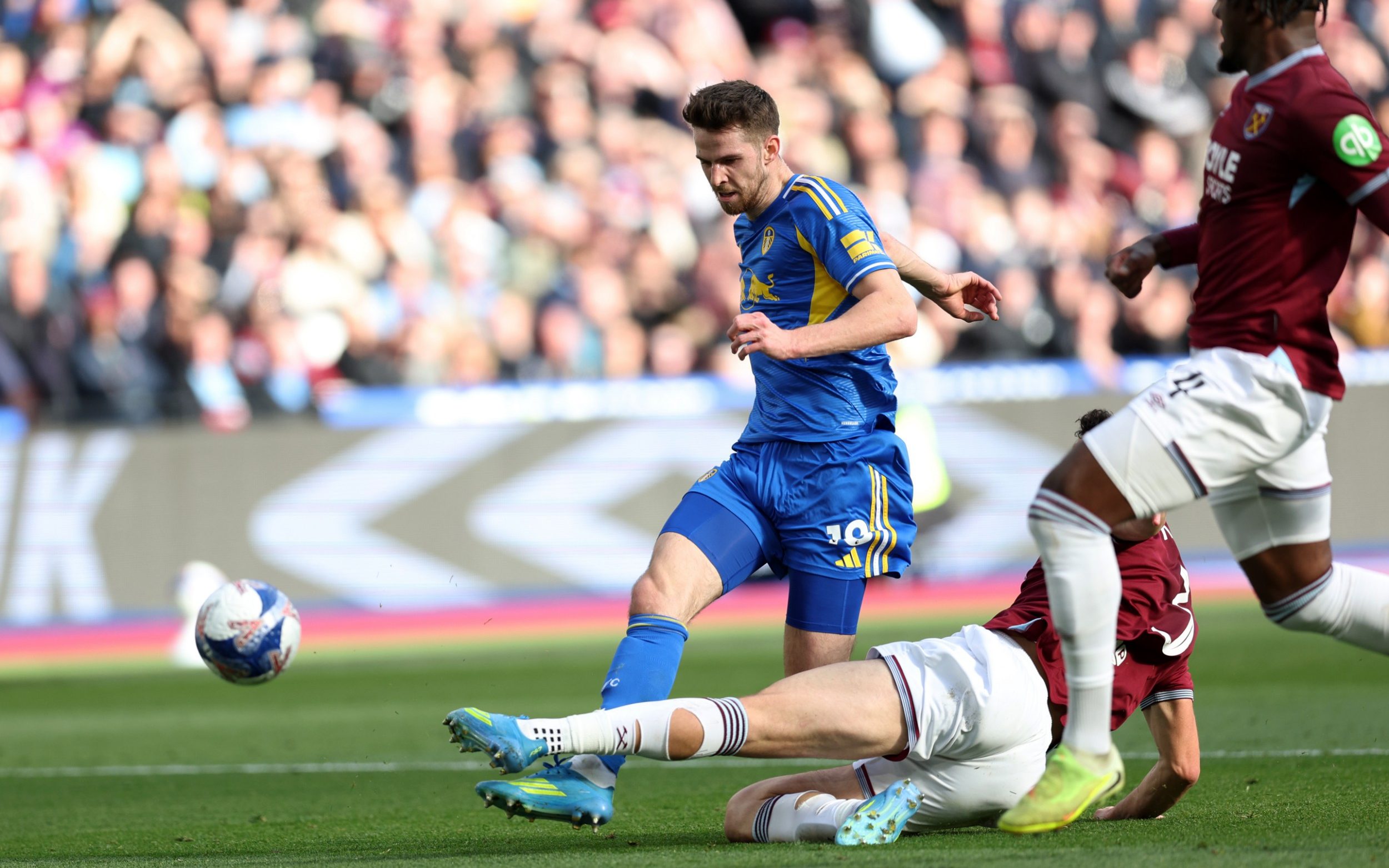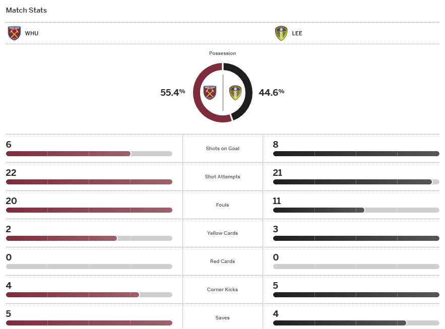 เข้าท้ายเกม ลีดส์ หาโอกาสได้อีกเมื่อ บอร์เนาว์ ดักบอลในแดนของ เวสต์แฮม แล้วขยับมาหน้าเขตโทษมีโอกาสให้ส่องไกลเลยขอยิงเองแต่โดนเซฟออกหลังไปได้