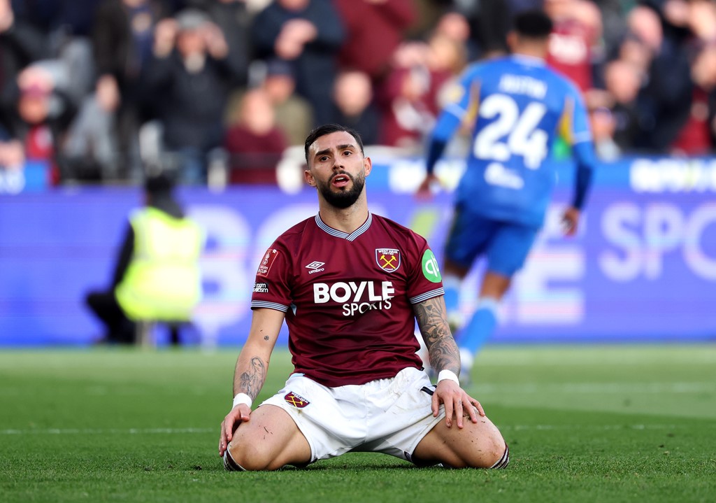 โอกาสของ เวสต์แฮม มากันอีกครั้งในจังหวะโต้กลับที่ ตราโอเร่ ฝั่งขวาเลี้ยงวนหนีตัวสกัดเข้ากลางแล้วจ่ายต่อ โบเว่น ซ้ายมือเข้าเขตโทษจบด้วยการกดมุมแคบโดน แปร์รี่ ปัดอีก