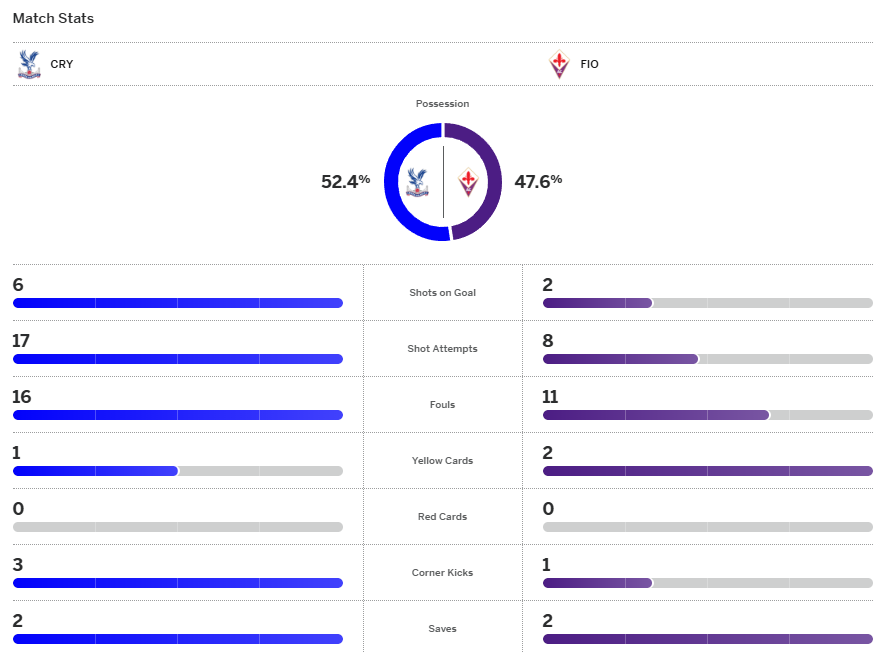 คริสตัล พาเลซ มาเหนือกว่าได้ ฌอง-ฟิลิปป์ มาเตต้า กับ ไทรีก มิตเชลล์ ช่วยกันยิงพาทีมนำห่างก่อนท้ายเกมได้ อิสไมล่า ซาร์ โหม่งเพิ่มอีก ปราสาทเรือนแก้ว เลยเอาชนะ ฟิออเรนติน่า 3-0 โอกาสเข้าสู่รอบรองชนะเลิศคอนเฟอเรนซ์ลีกมีสูง