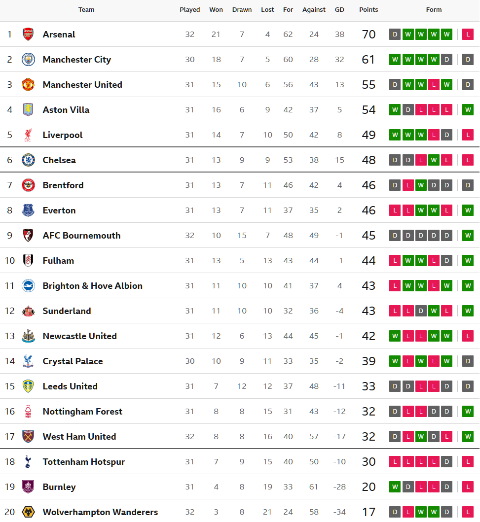 การลุ้นแชมป์ลีกของ อาร์เซน่อล หวั่นกว่าเดิมหลังโดนนำไปก่อนแล้วถึงแม้ วิคตอร์ เยอเคเรส ซัดจุดโทษไล่ตีเสมอได้แต่หลังจากนั้นก็ยังเล่นไม่ออกจนโดน อเล็กซ์ สก็อตต์ ยิงฝัง ปืนใหญ่ พ่ายต่อ บอร์นมัธ คาบ้าน 2-1 ทำให้พวกเขายังนำ แมนเชสเตอร์ ซิตี้ อยู่ 9 แต้มก็จริงแต่แข่งมากกว่า 2 นัด