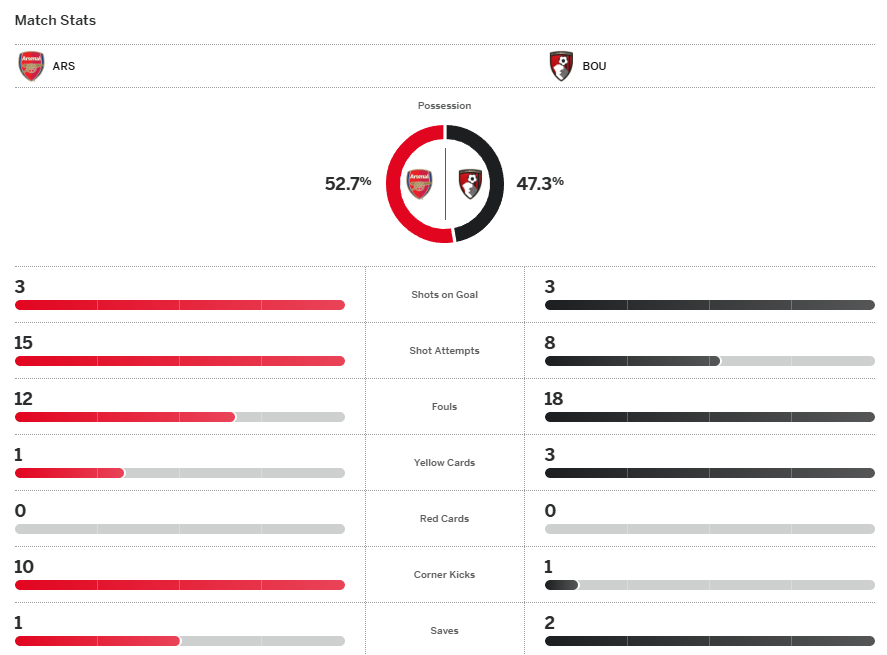 อาร์เซน่อล ยังหาทางเจาะผ่านการเพรสซิ่งของ บอร์นมัธ ลำบากก่อนมาได้จังหวะส่งบอลเข้าประตูไปแต่ไม่ได้เมื่อ ไวท์ วางบอลข้ามแผงหลังส่ง เยอเคเรส หลุดเดี่ยวไปยิงเข้าประตูแต่มีธงล้ำหน้า