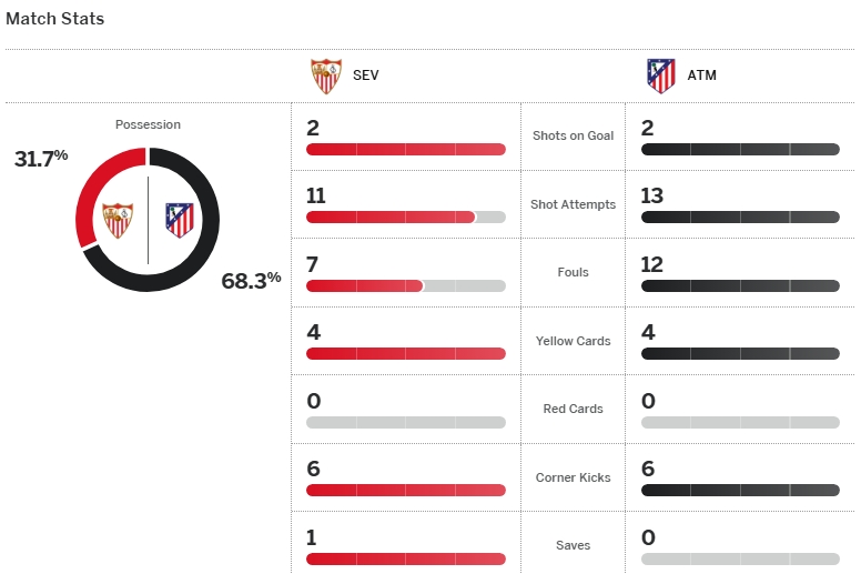 ใจอยู่กลางสัปดาห์แล้วสำหรับ แอตเลติโก้ มาดริด นัดนี้จัดโรเตชั่นเกือบยกแผงจนโดนยิงตั้งแต่นาทีที่ 10 จากจุดโทษของ อากอร์ อดัมส์ แม้ว่า ฆาเบียร์ บอนยาร์ มายิงตีเสมอ แต่แล้ว เนมันย่า กูเดลจ์ โหม่งพังประตูชัยให้ เซบีญ่า เปิดบ้านเฉือนชนะ 2-1