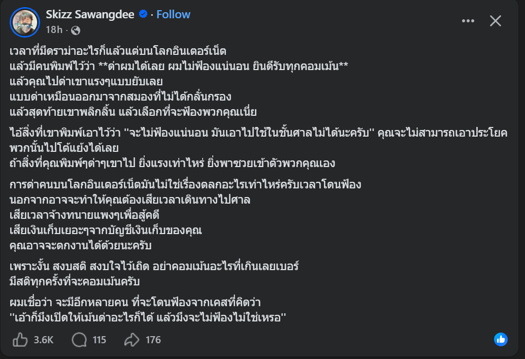 เชื่อเค้าเถอะครับ คนที่โพส ผมให้เป็นเจ้าพ่อเห็นการฟ้องเกรียนเลย จัดมาหลายเคส แล้วคนนี้