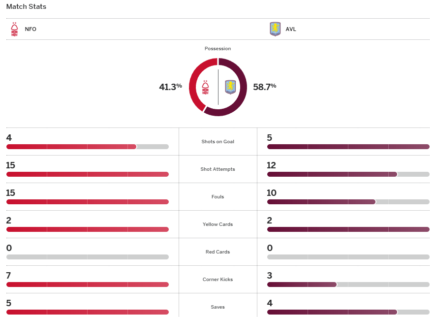 เป็นเกมที่ได้ลุ้นกันทั้งสองทีมโดยเฉพาะแอสตัน วิลล่า ที่มีโอกาสหลายหนแต่ส่งบอลผ่านมือแมตซ์ เซลส์ ไม่ได้ โดยพวกเขาได้ประตูขึ้นนำจากการทำเข้าประตูตัวเองของมูริลโล่ ก่อน เนโก้ วิลเลี่ยมส์ มาซัดเบียดเสาตีเสมอให้น็อตติ้งแฮม ฟอเรสต์ เสมอ 1-1 แบ่งแต้มกันไป