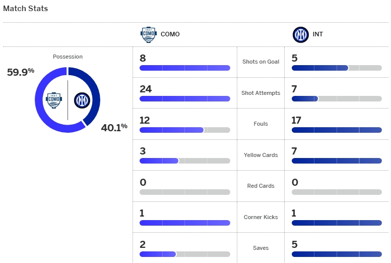 เป็นเกมที่เปิดแลกกันอย่างสนุก โดย โคโม่ เป็นฝ่ายสร้างโอกาสได้มากกว่า และออกนำไปก่อนถึงสองประตู อย่างไรก็ตาม อินเตอร์ มิลาน แสดงให้เห็นถึงความเฉียบคม ด้วยการยิงคืนสี่ประตูรวดพลิกแซง โดยได้ มาร์คุส ตูราม และ เดนเซล ดุมฟรีส์ เหมาคนละสองประตู แม้ช่วงท้ายเกมเจ้าบ้านจะฮึดยิงตีตื้นได้ แต่ก็ไล่ไม่ทัน สุดท้ายเป็น “งูใหญ่” ที่บุกเอาชนะไปได้ 4-3 พร้อมนำโด่งเป็นจ่าฝูงต่อไป