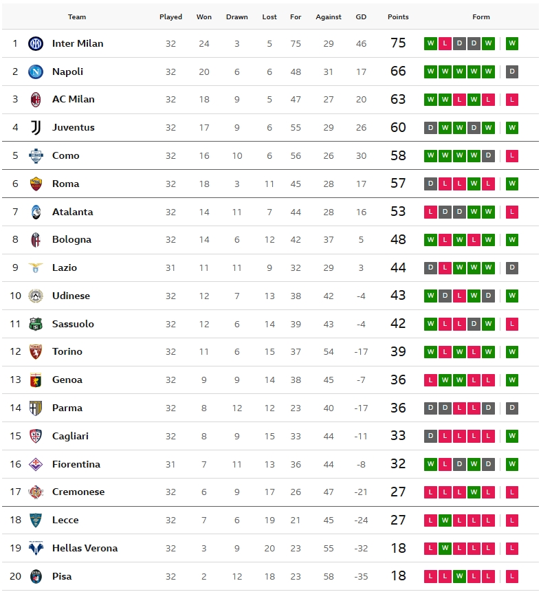 จบเกม อินเตอร์ มิลาน บุกไปพลิกชนะ โคโม่ 4-3 เก็บเพิ่มเป็น 75 คะแนน ทิ้งห่าง นาโปลี 9 แต้ม ส่วน โคโม่ หล่นไปอยู่อันดับ 5 ตามหลัง ยูเวนตุส อันดับ 4 อยู่ 2 แต้ม