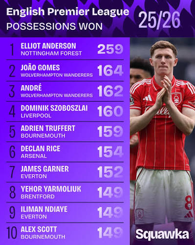 แบ็คซ้ายบอร์นมัธ อาเดรียง ทรุฟแฟร์ และปีกเอฟเวอร์ตัน อิลิมัน เอ็นดิอาย ทั้งคู่ติดท็อป10นักเตะที่แย่งบอลมาให้ทีมครอบครองได้สำเร็จ
